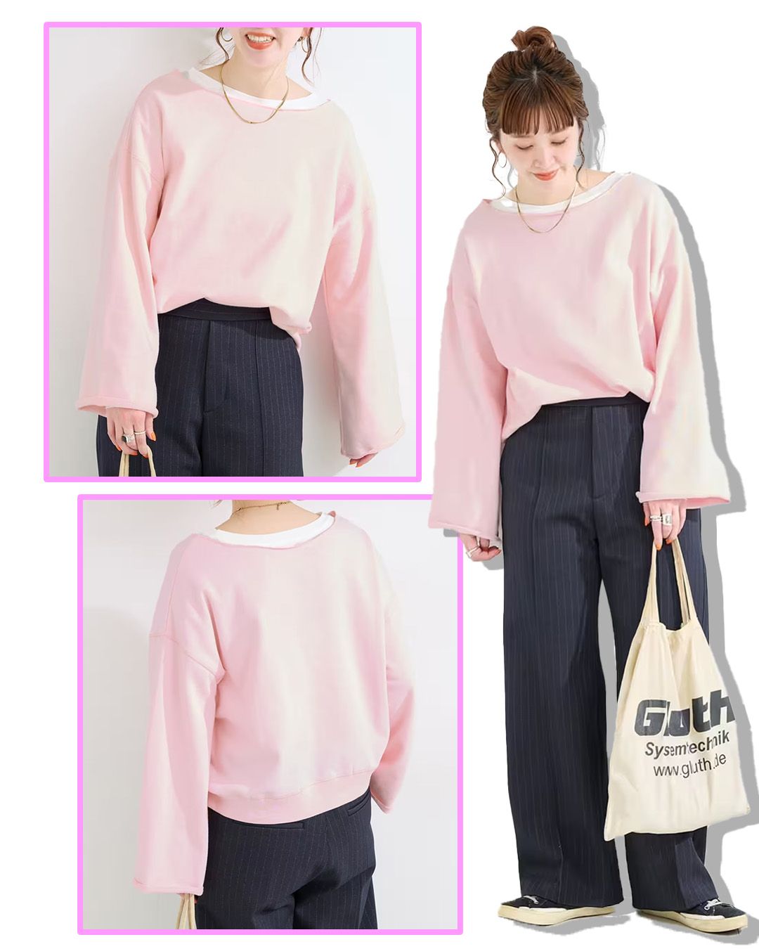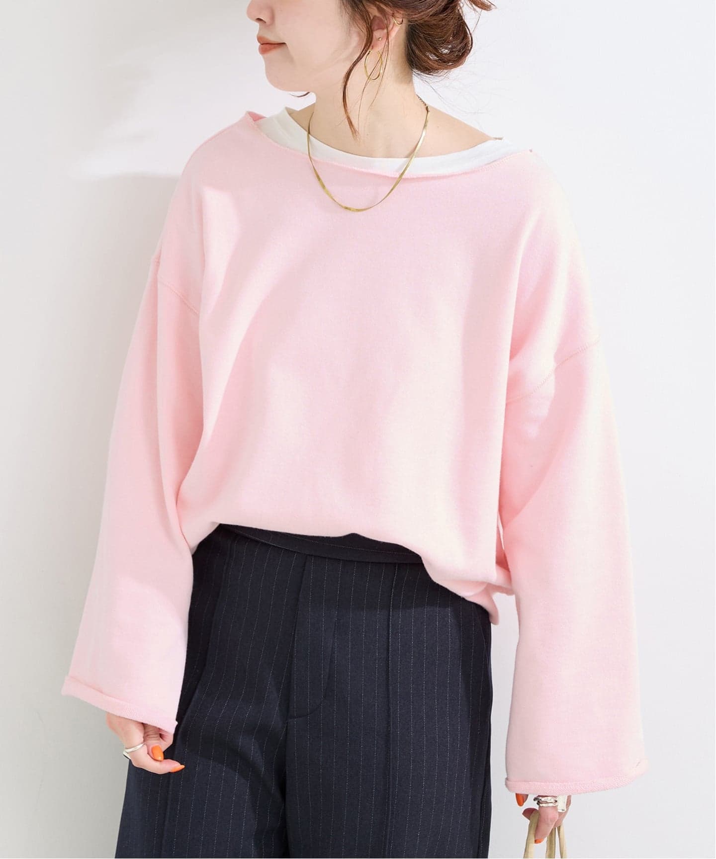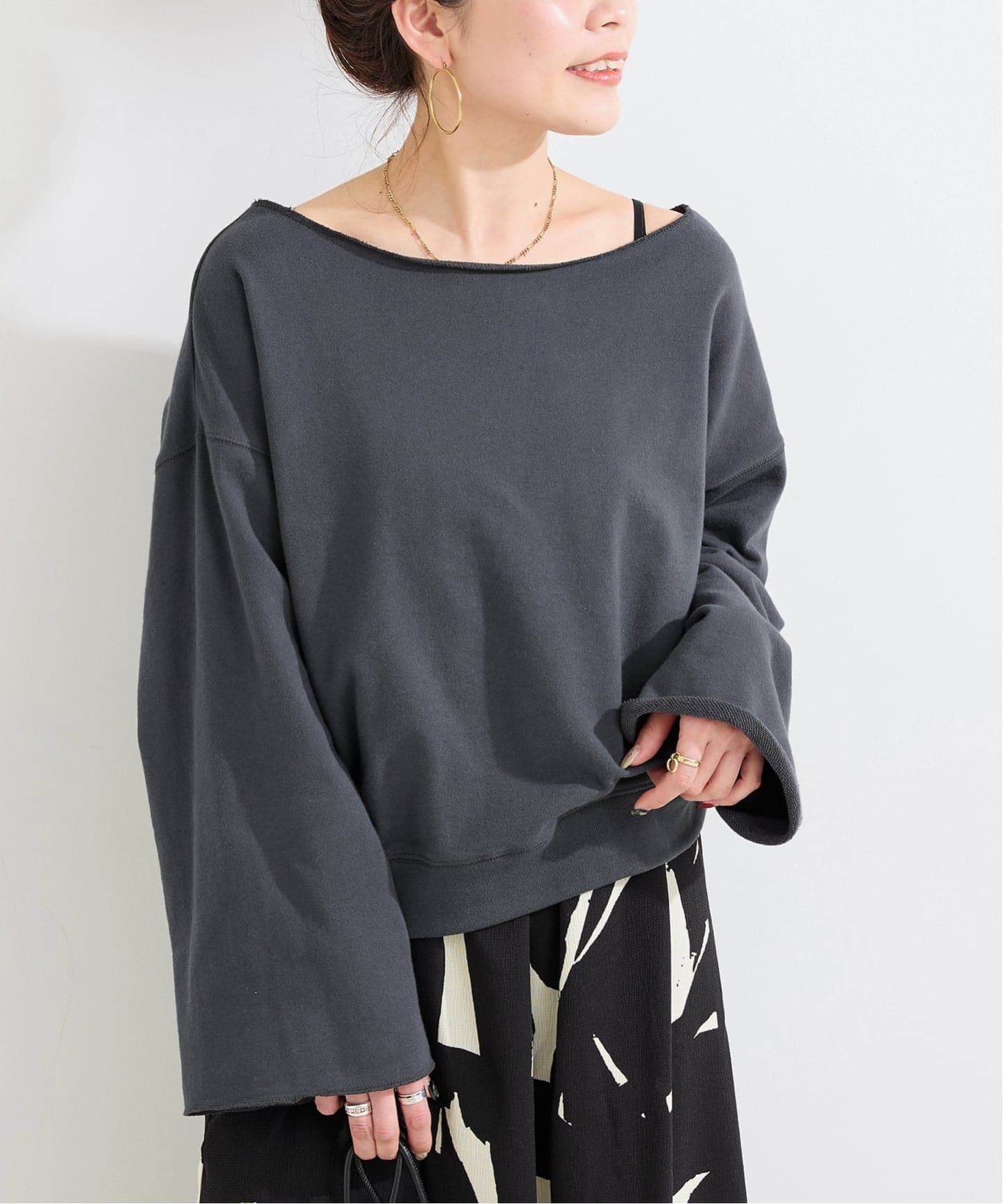 ベーシックでシンプルなデザインなので、飽きなくスタイリングができる着回し力抜群のベーシックアイテムです。カジュアル見えですが、程よくデコルテが見え、首元と袖口が裁ち切りになったディティールが抜け感を与えてくれます。