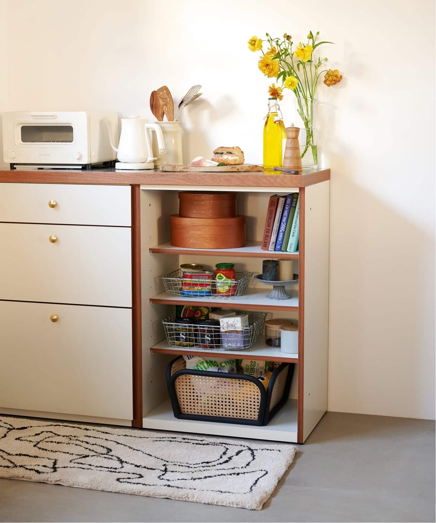 食器やストック、かご収納などを組み合わせて、見せる収納としても活躍します。