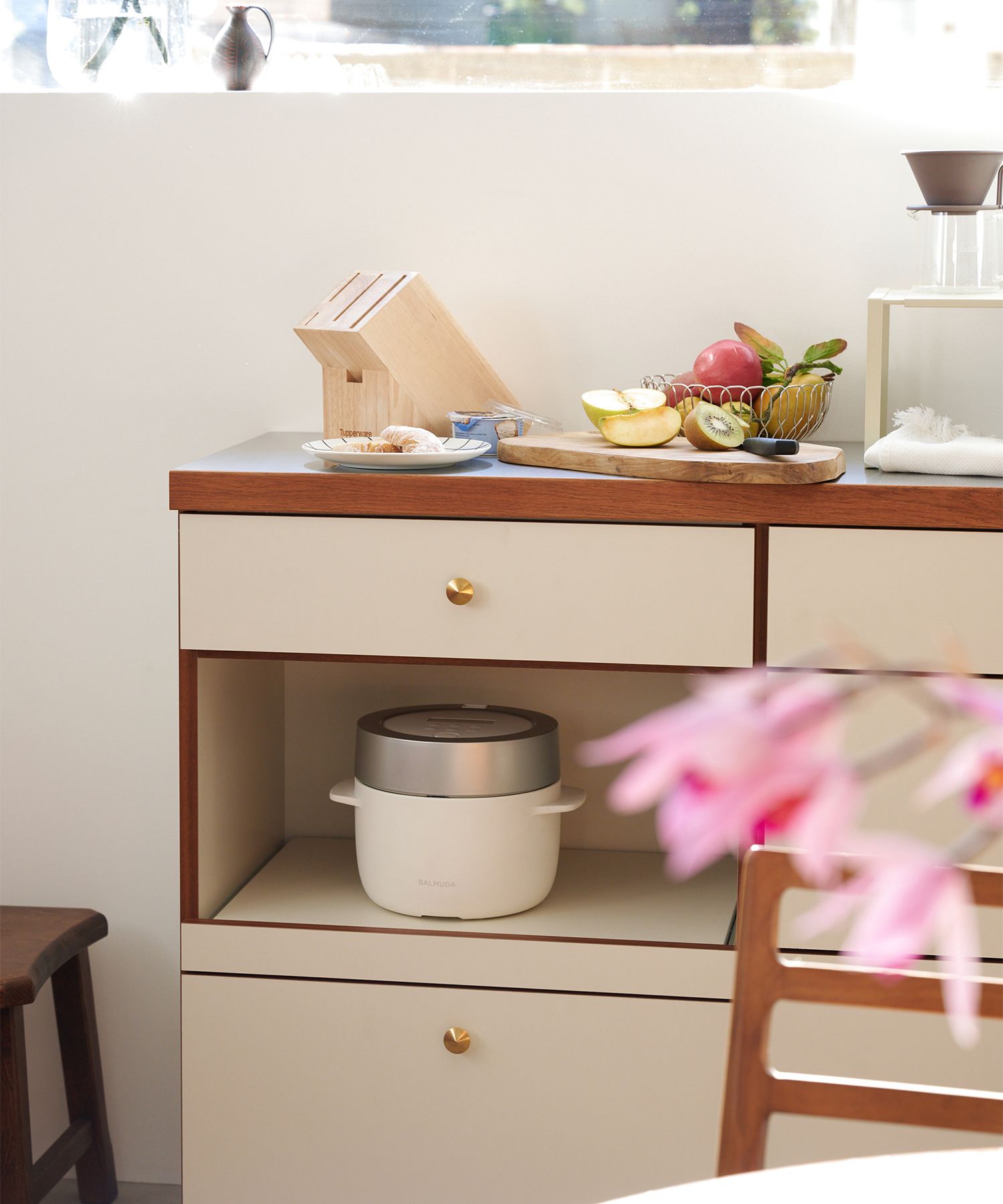 トースターや電子レンジなどの家電を置きやすい設計で、配線用のコード穴もあらかじめ設けています。