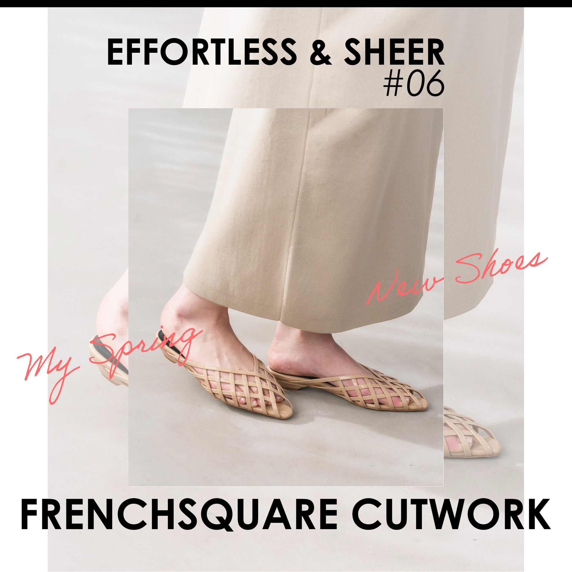 カットワークの清涼感に女性らしいミュールデザインが春らしい。