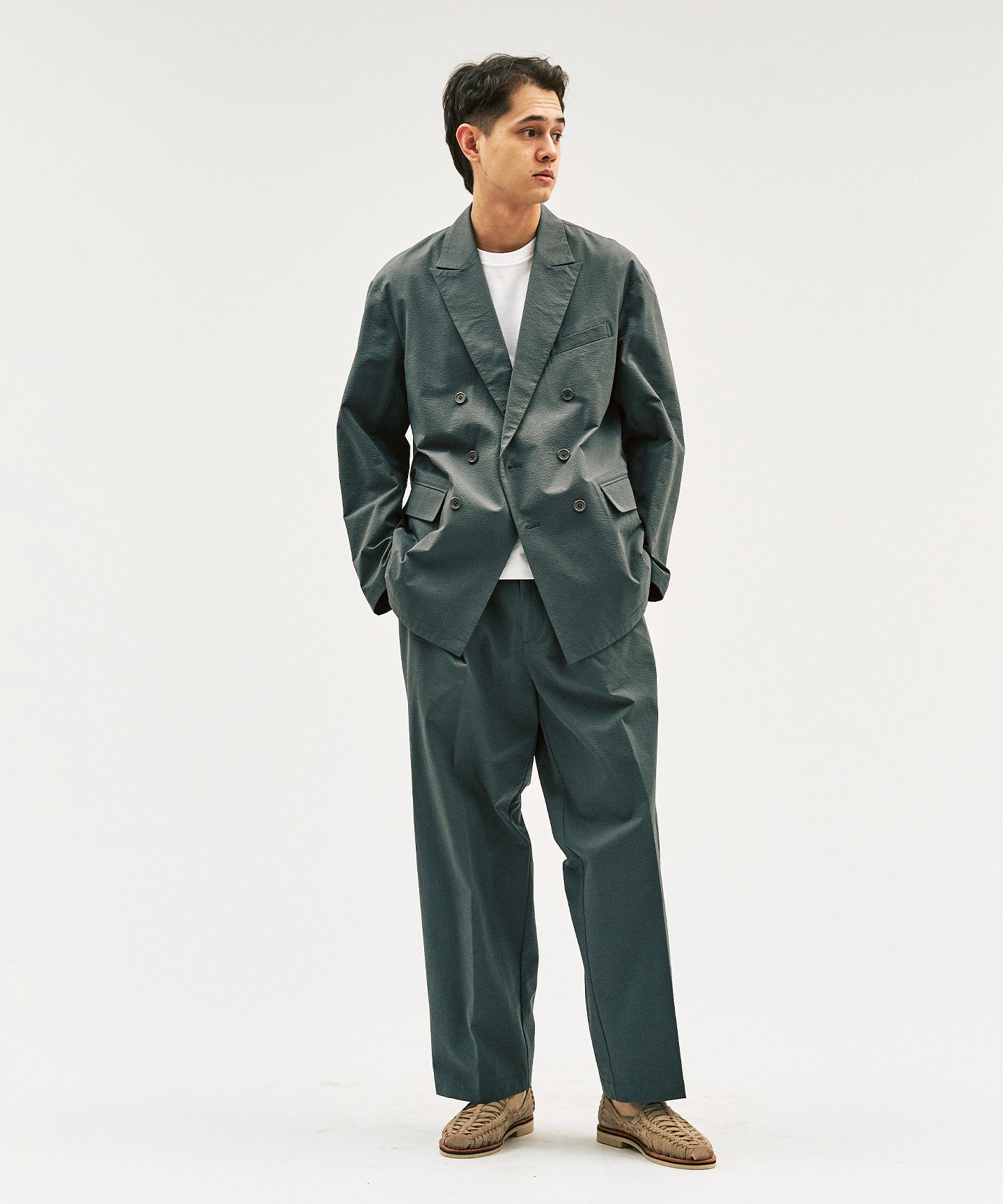 大人気のダブルセットアップが、新生地で登場。軽量で細かなワッシャー感が特徴のサッカー素材を使用しています。凹凸のある生地表情が肌離れを良くし、軽やかで快適な着用感を実現。ワイドシルエットでも重く見えず、かしこまりすぎない抜け感が今の空気感にフィットします。
