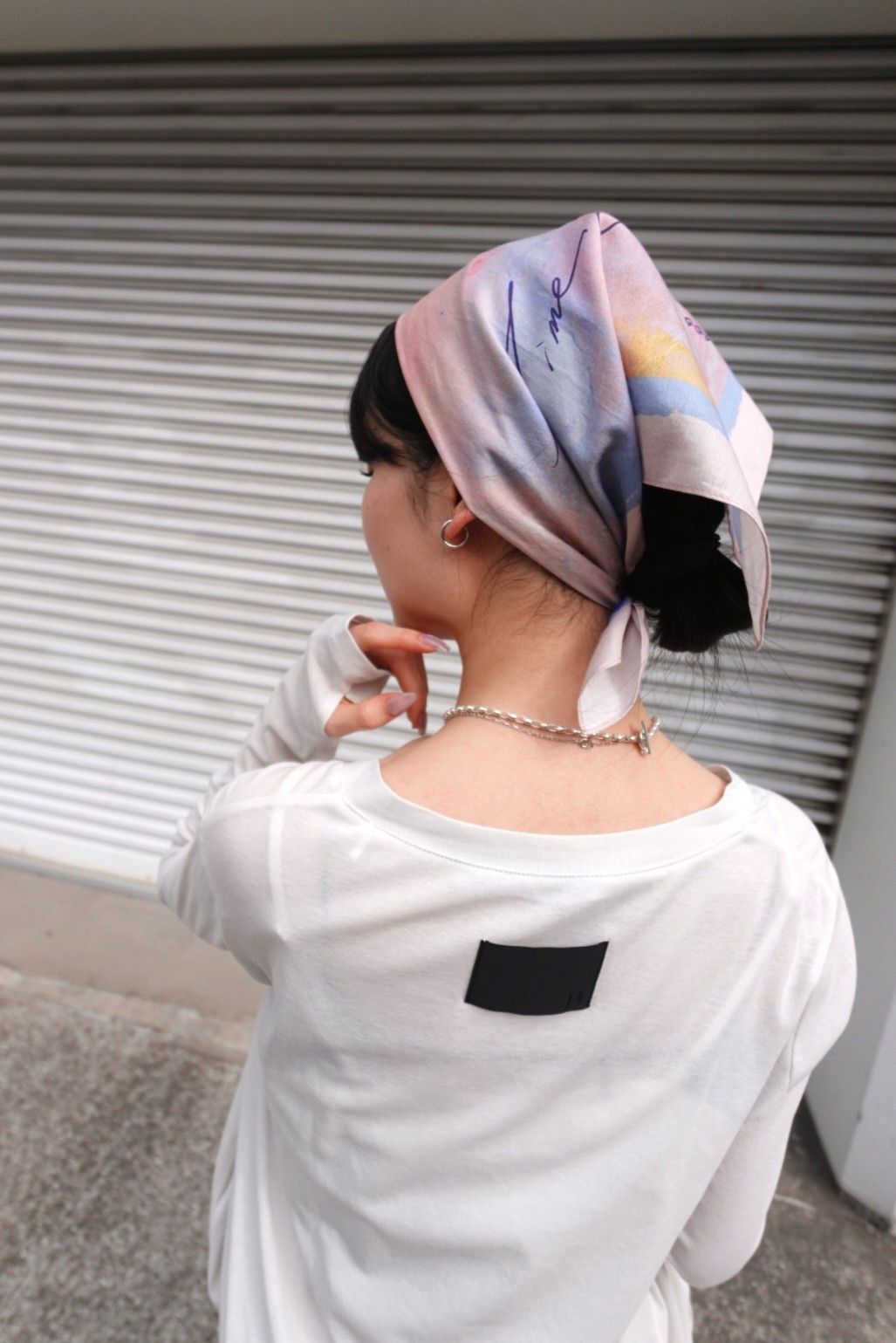 ダスティーローズをあしらったノベルティースカーフをヘッドアクセにして、