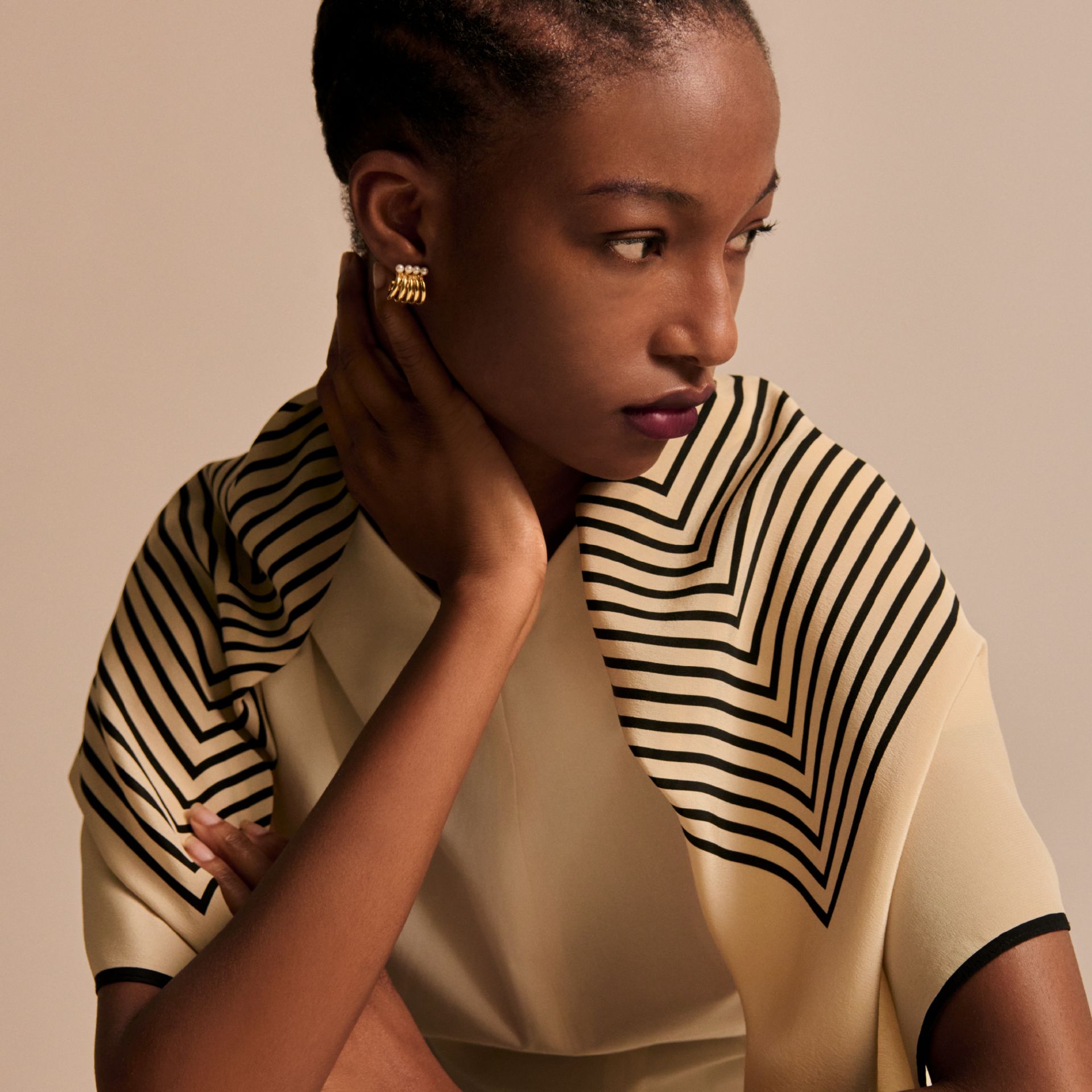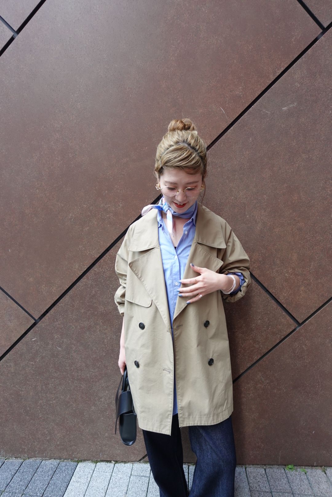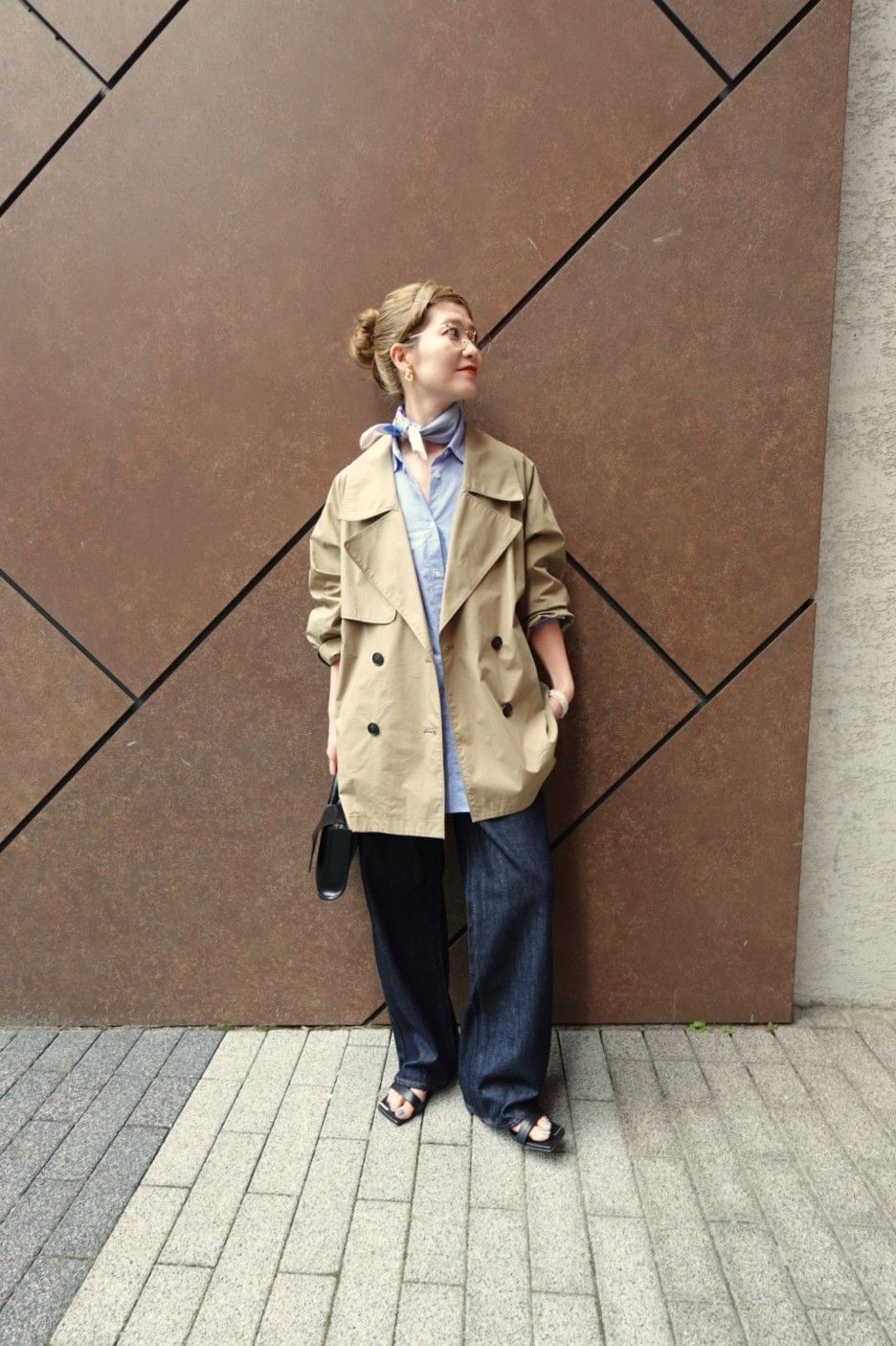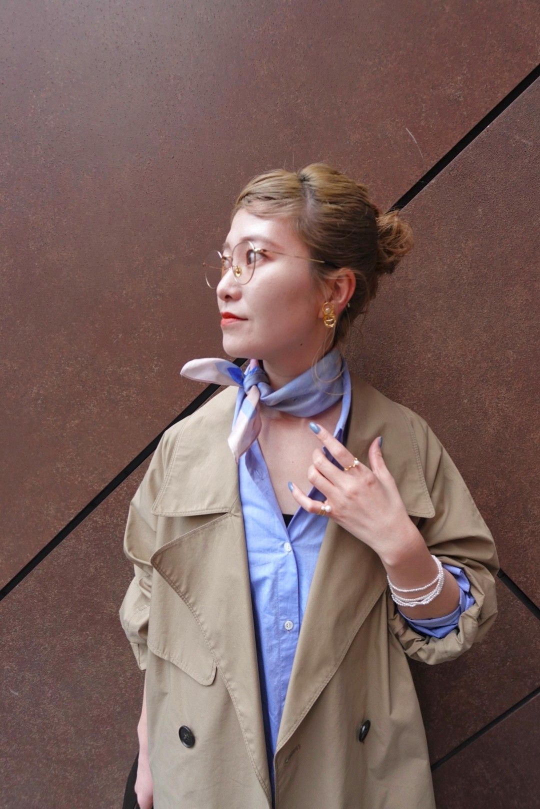 ベージュ〜ブラウンのグラデーションの中にスカーフアレンジを取り入れて。