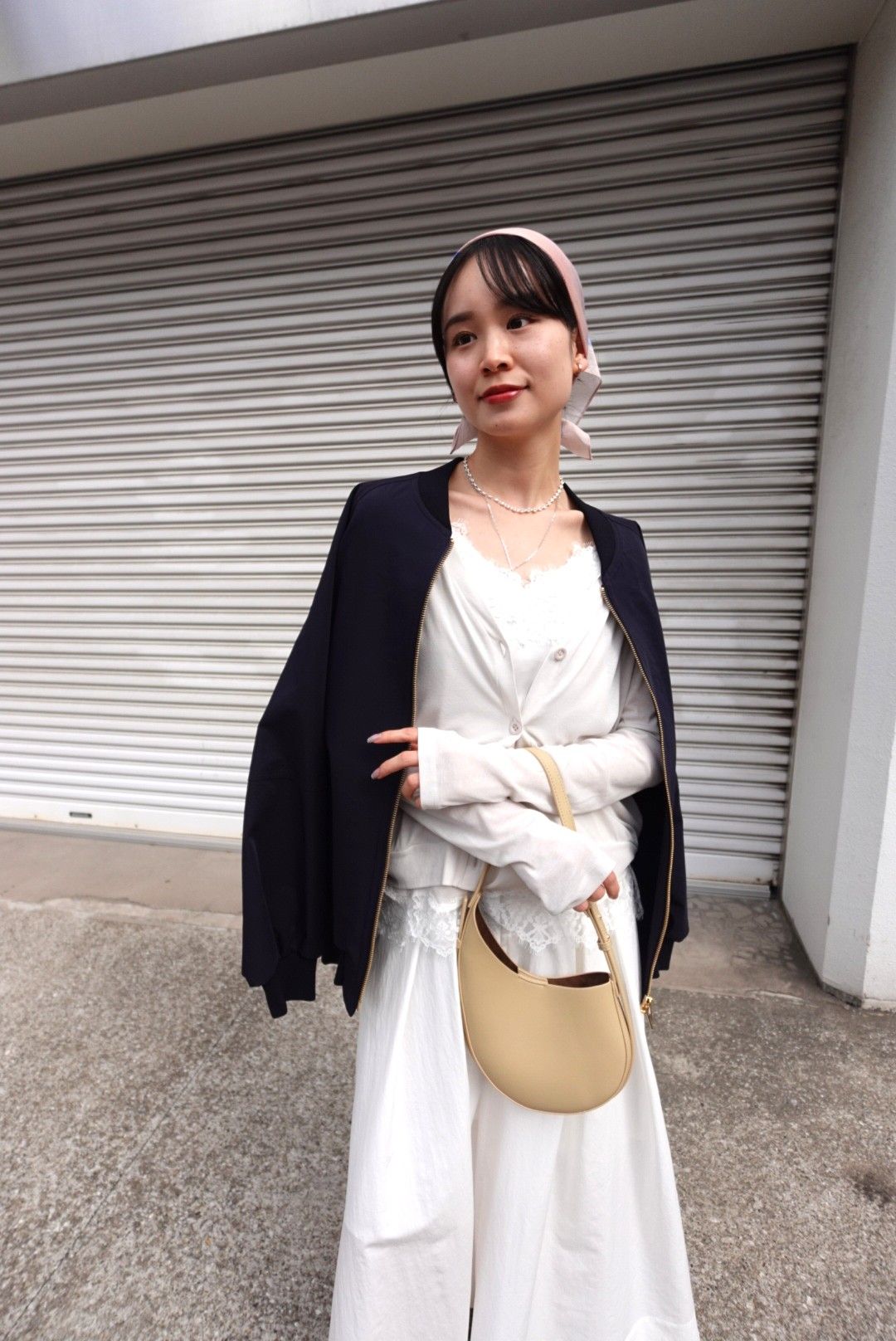 大人の甘めホワイトコーデを、スポーティーなMA1ブルゾンで引き締めて。