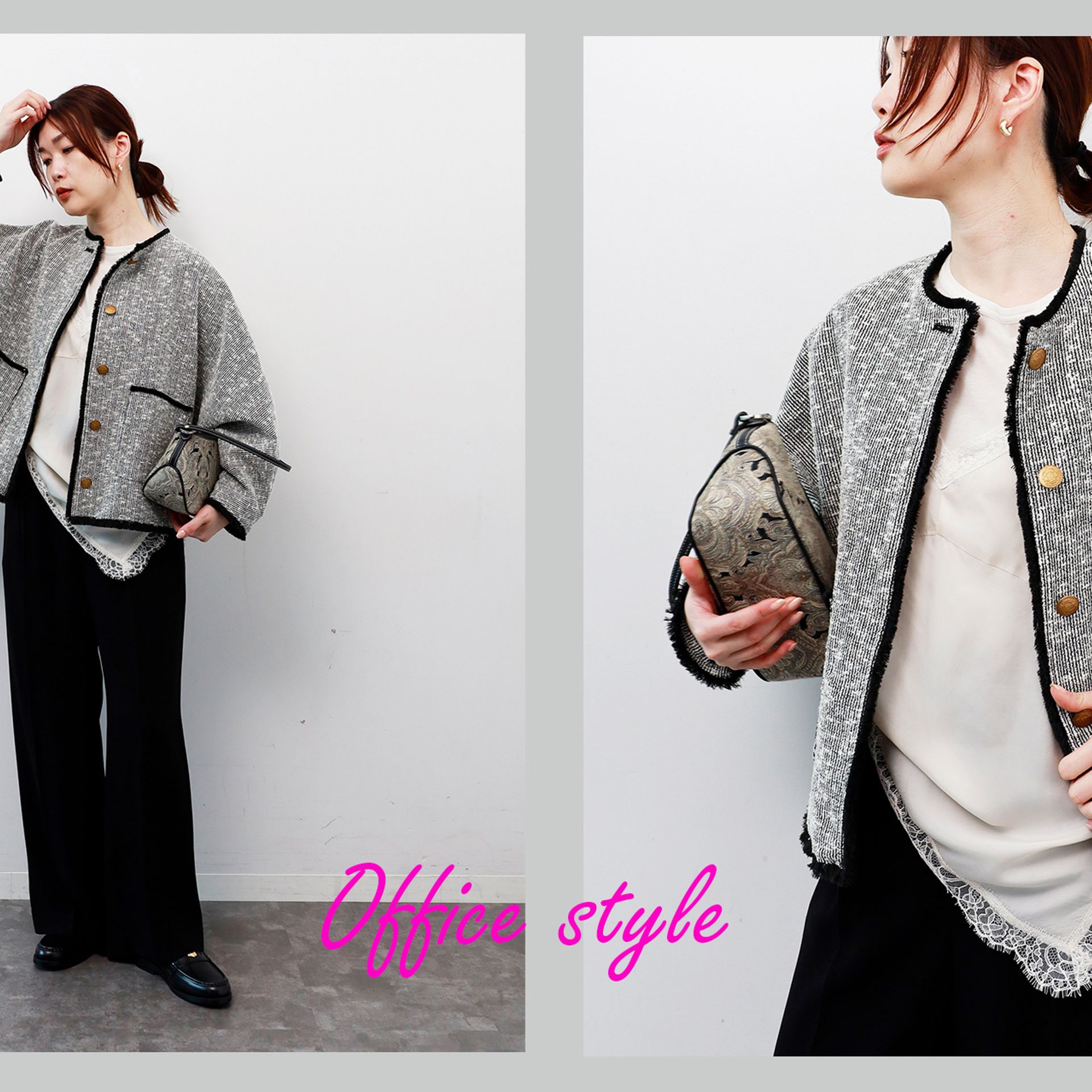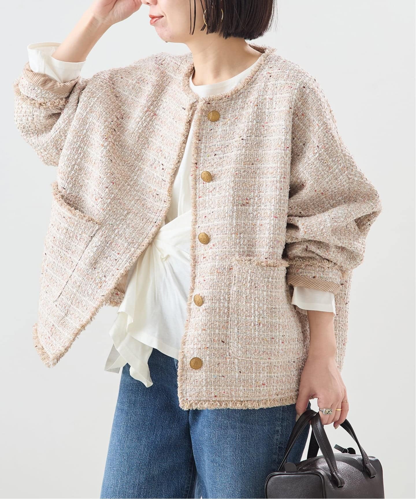 イタリアのGIOLICA社の生地を使用したツイードジャケット。肩がおちたゆったりとしたシルエットで、コンサバにならないようなサイズ感になっています。