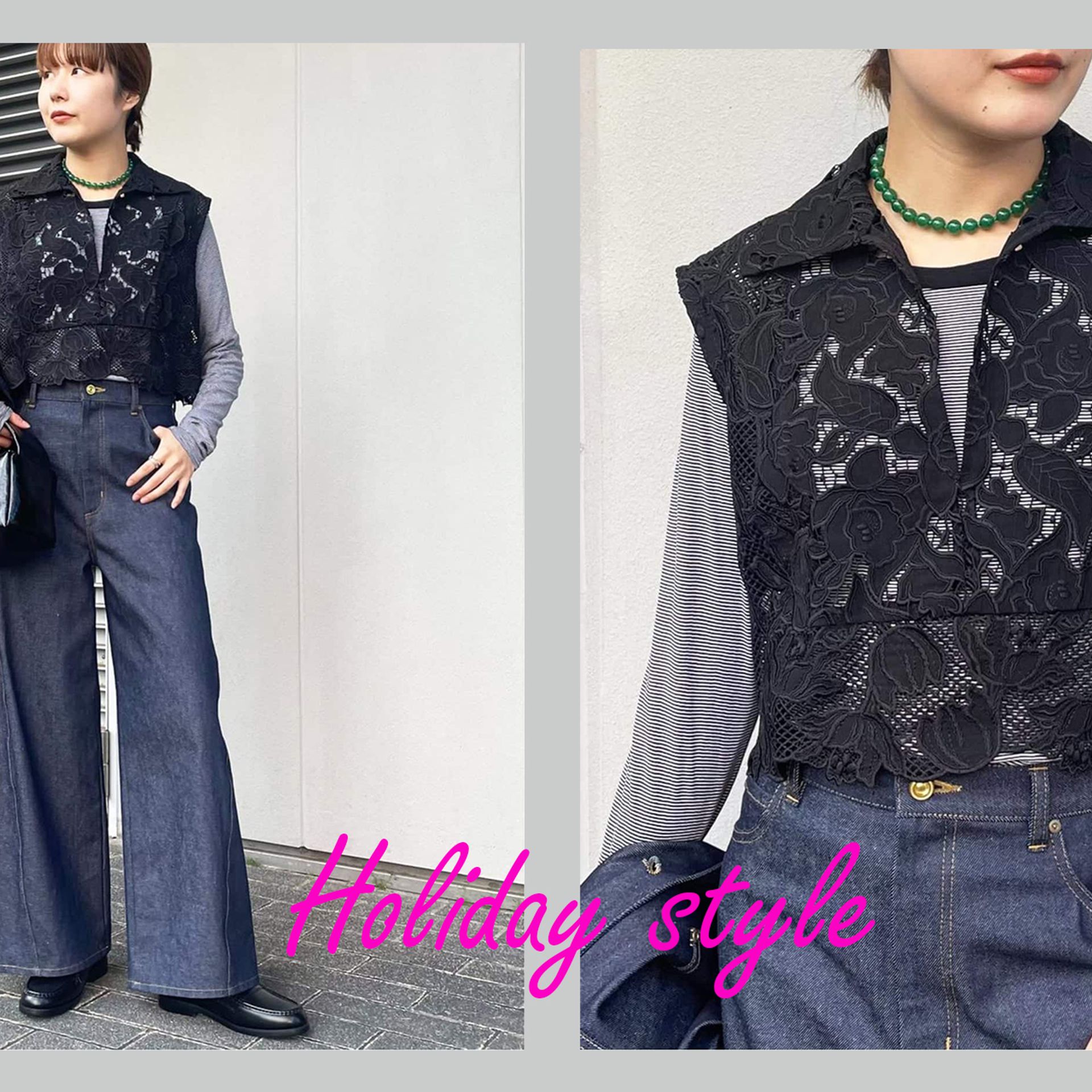 今シーズン最も注目を集めるレースアイテム。そのレースをL'ESSAGEらしく、ベストに仕上げました。フロントのボタンにもこだわり、ヴィンテージ調のボタンをカラーによって違うボタンを付けています。スラックスパンツとのONスタイルはもちろん、デニムやイージーパンツとさらっと合わせても◎