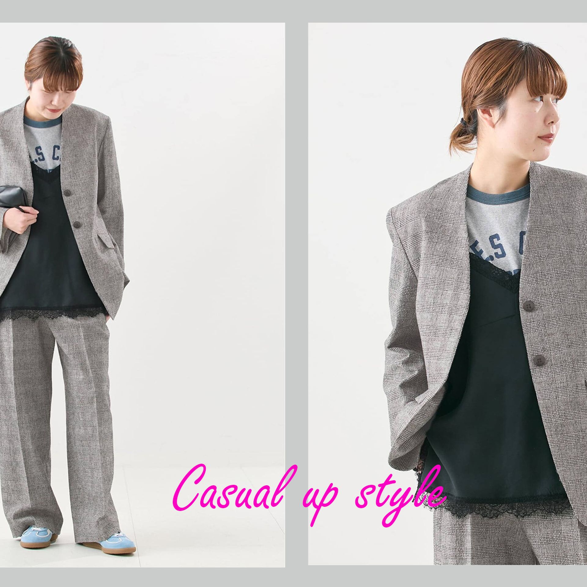 上下が揃った統一感のあるスタイルは、コーディネートの手間を省きながらも、洗練された印象を演出してくれます。ビジネスシーンはもちろん、オケージョンやきれいめカジュアルまで幅広く対応できるのが魅力。