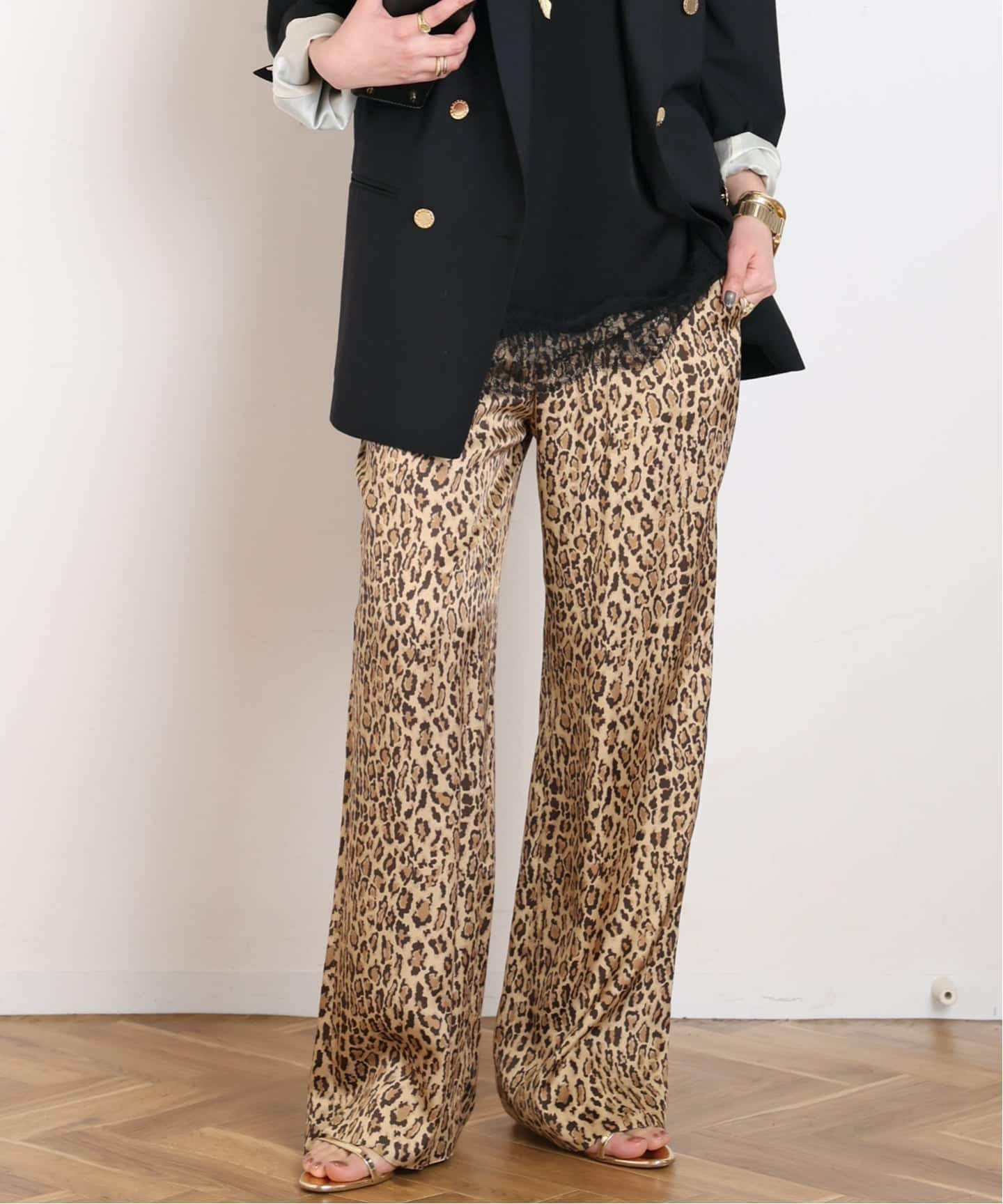 ツヤのあるサテンにレオパード柄をプリントしたシャツとパンツ。