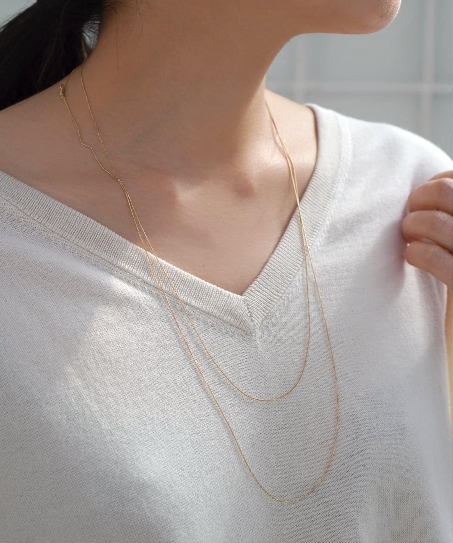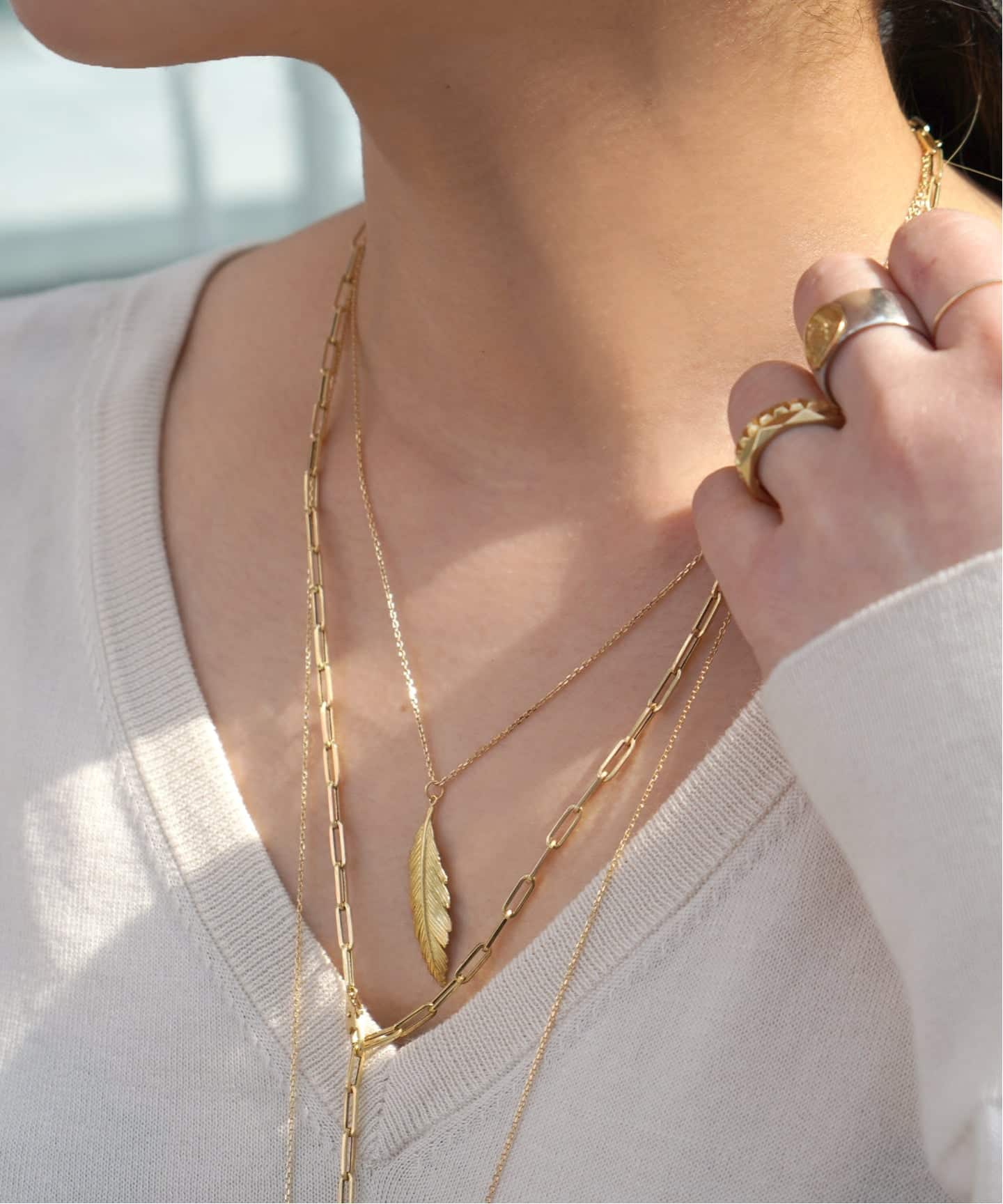 まるで金糸のような繊細なチェーンは、シンプルでありながら素肌にのせた時に存在感を放つ。