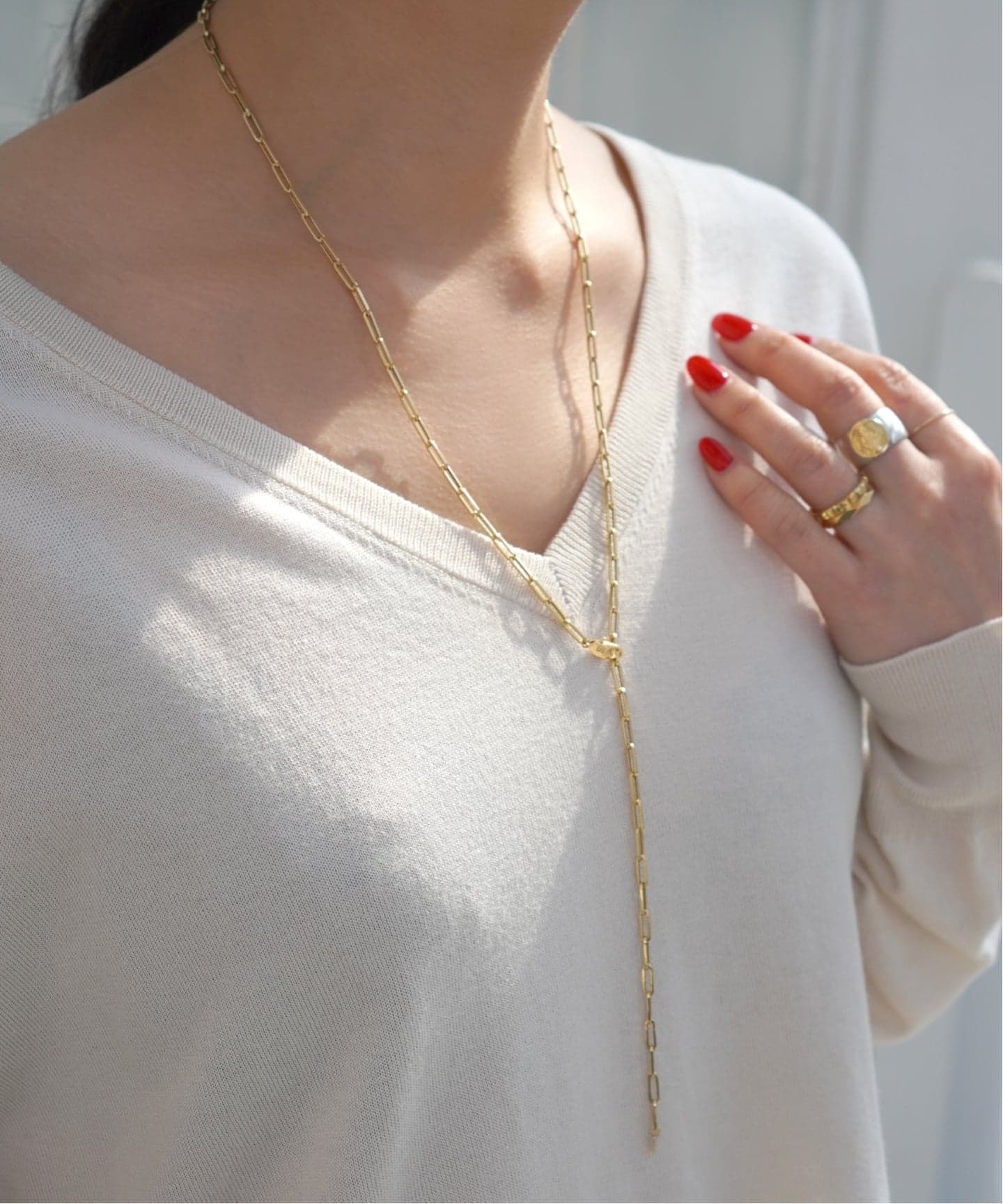 チェーンのどの位置でも留めることができることから、ループ状はもちろん、Y字ネックレスのようにも。