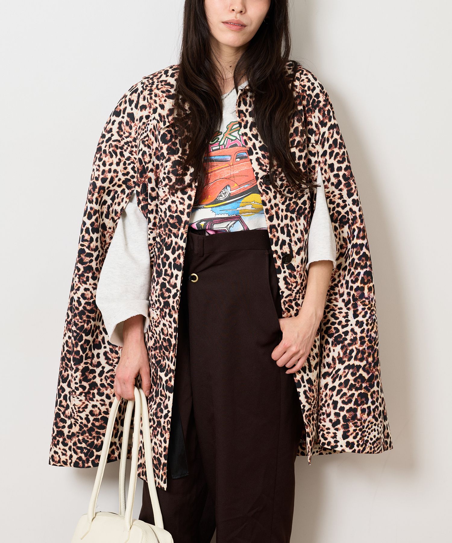 細番手の糸を密に織り上げた上品なグログランの生地にオリジナルのレオパード柄をのせ仕上げたマントコート。