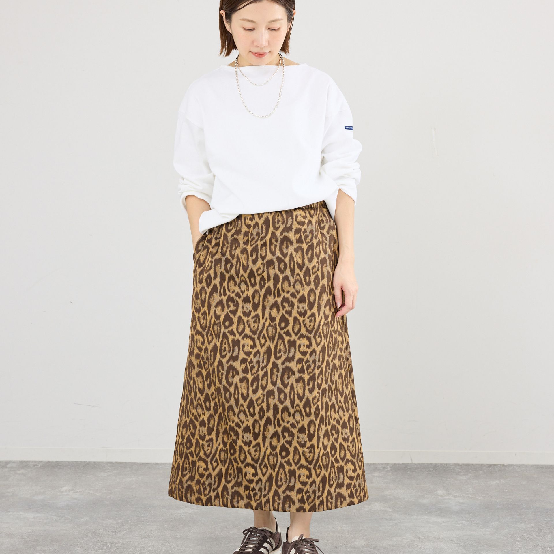 主役級のレオパード柄のスカートを上品に仕上げてくれる、ブラウンカラー。