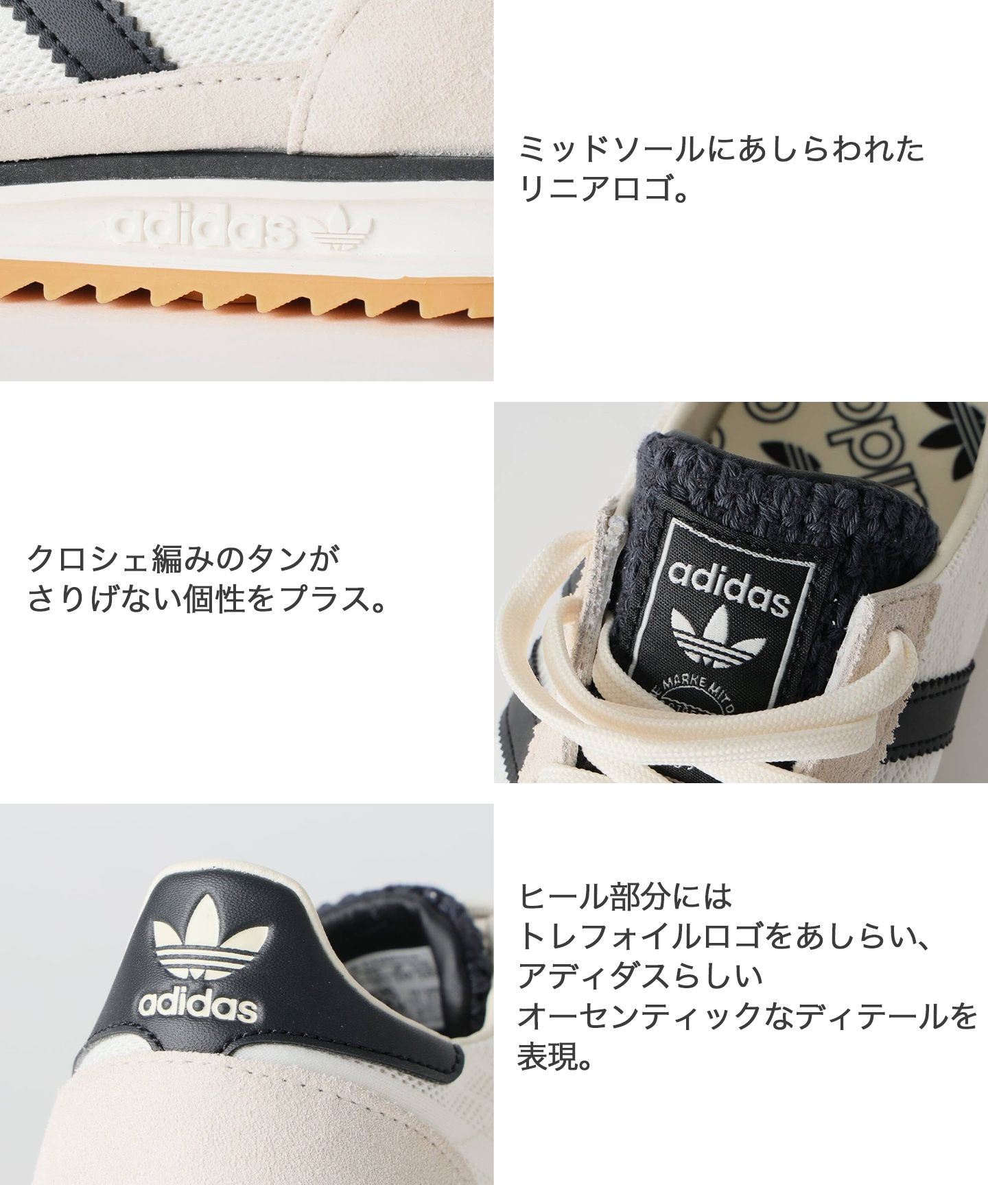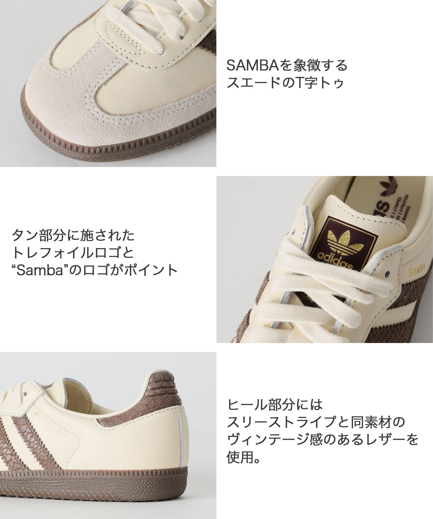 タンとヒールのトレフォイルロゴ、ミッドソールのリニアロゴがブランドのヘリテージをしっかり表現。