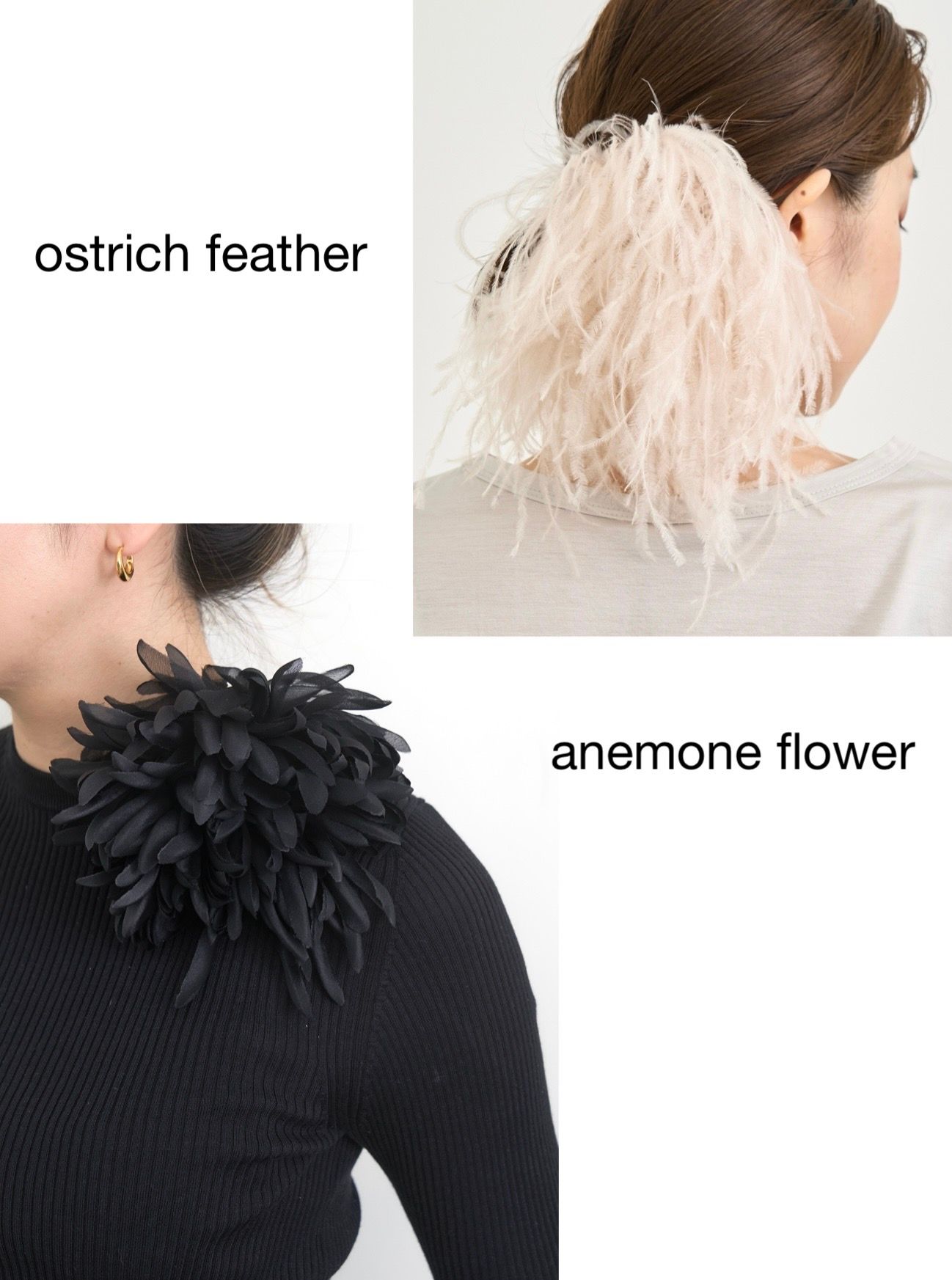 存在感たっぷりなコサージュは、オーストリッチフェザーとアネモネフラワーの2型です。
