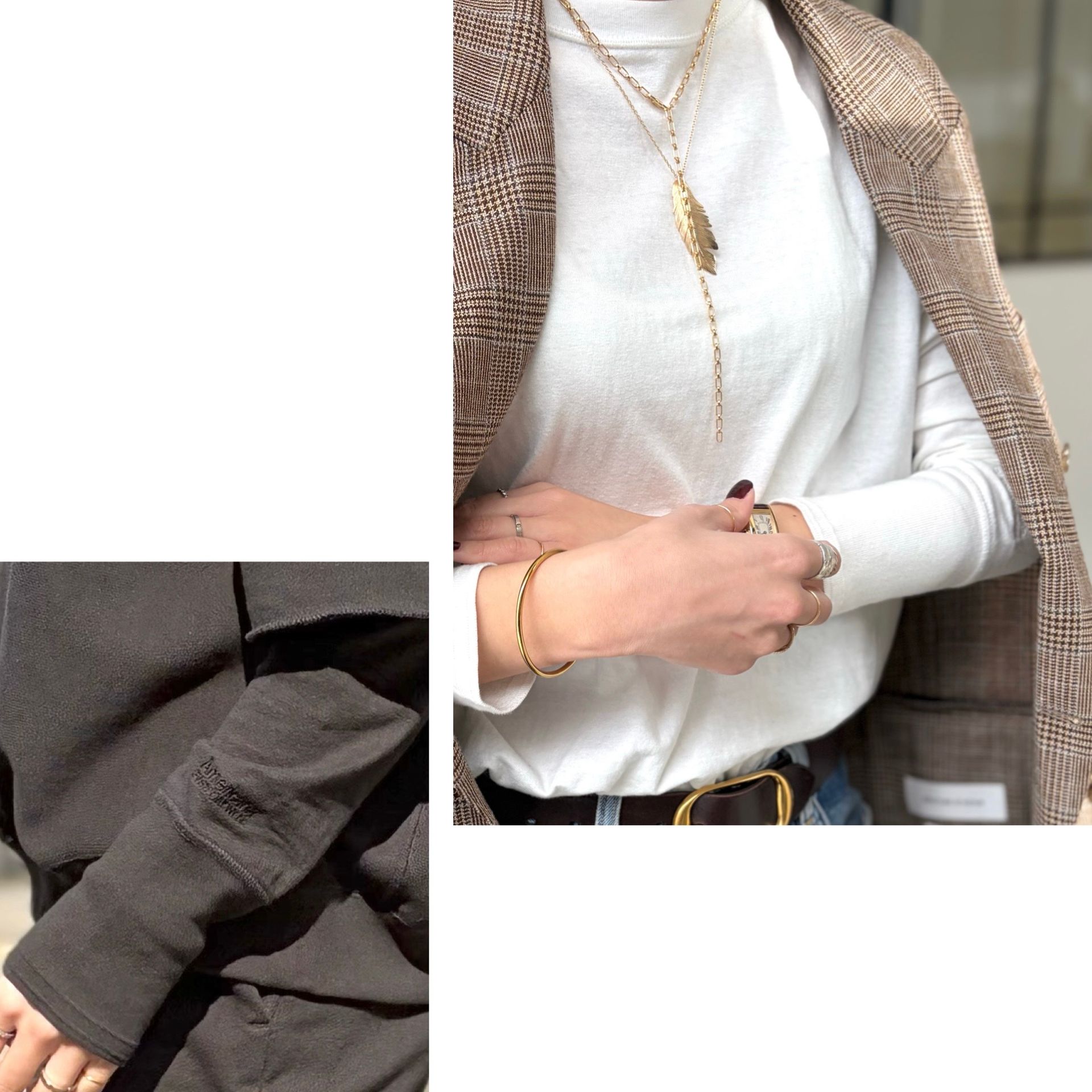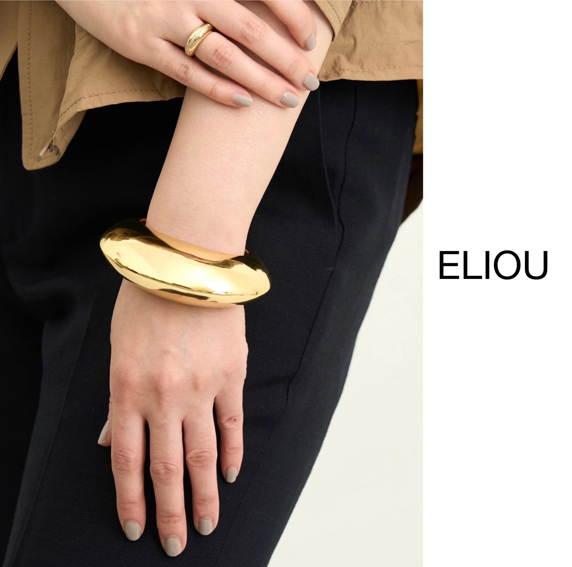 存在感たっぷりのゴールドバングルは、ぽってりと丸みを帯びたフォルムで手元にモダンなアクセントを添えてくれます。