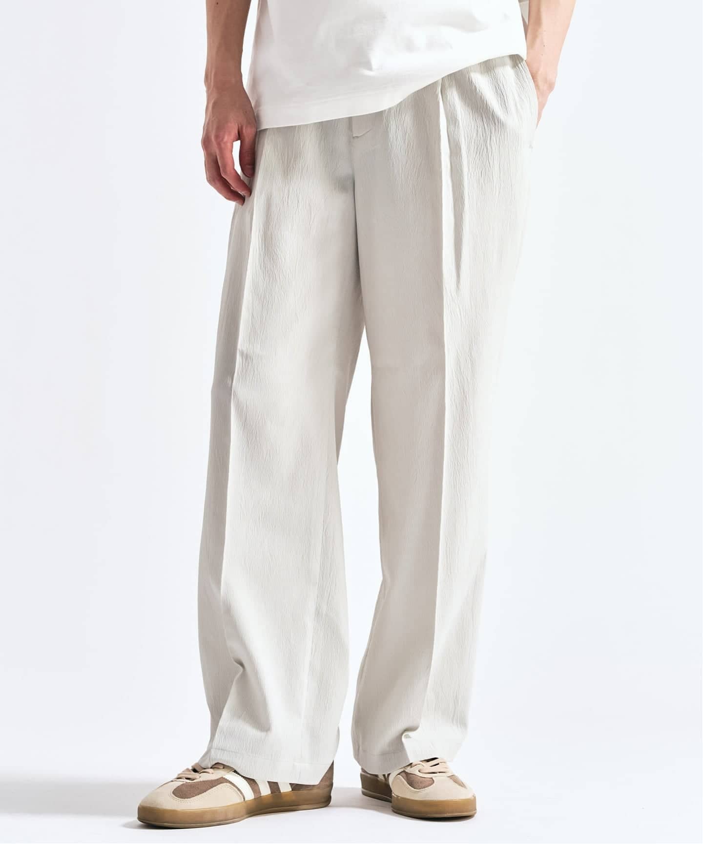 軽やかで上品に穿ける、大人のためのワイドスラックス。清涼感のあるクレープ素材を使用し、ワイドながらもすっきりとした印象に仕上がっています。快適さときれいめな見え方を両立したい方におすすめ。