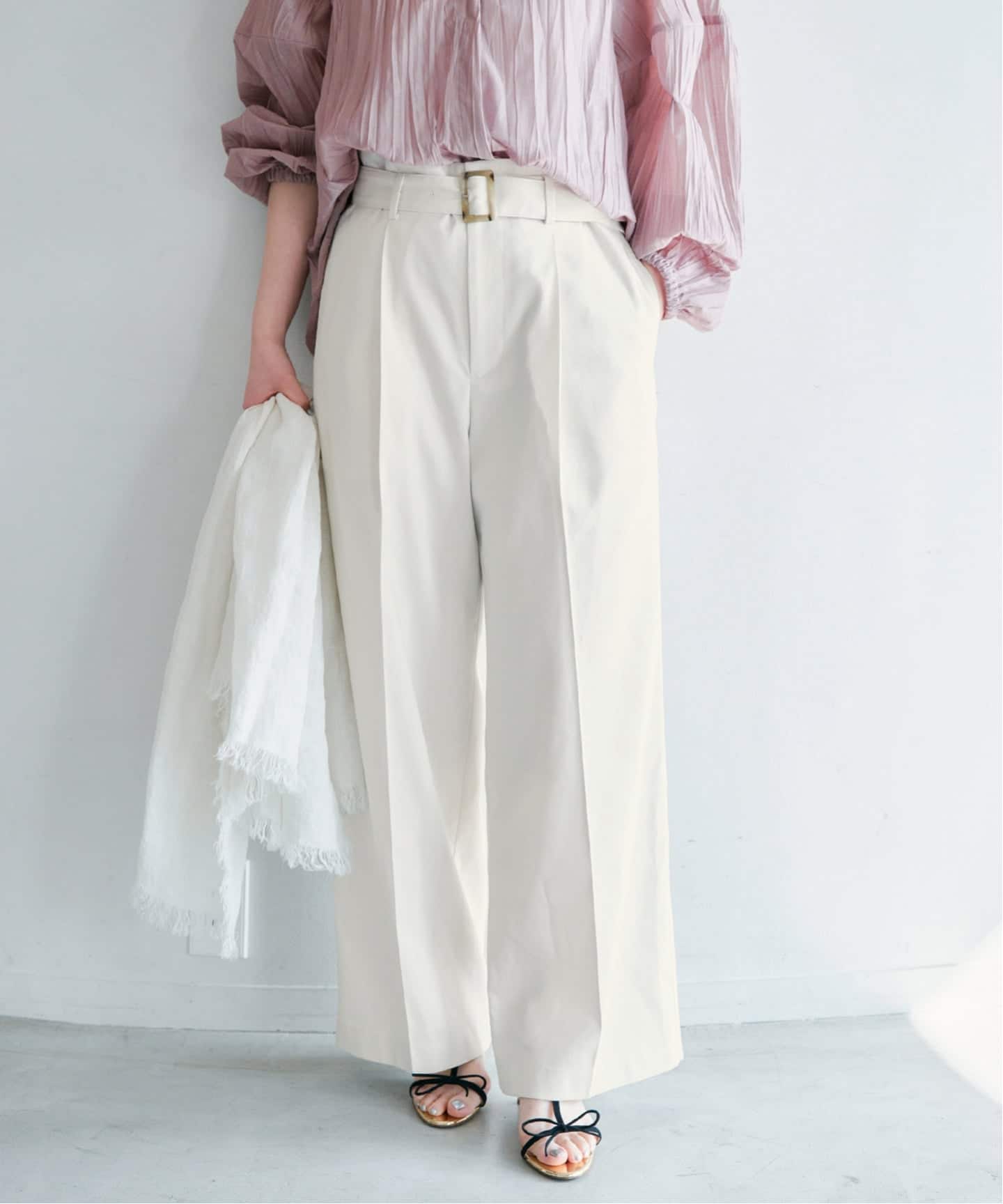 ニットとサンダルは甘めのデザインなので、パンツですっきり感をプラスしてみました◎」