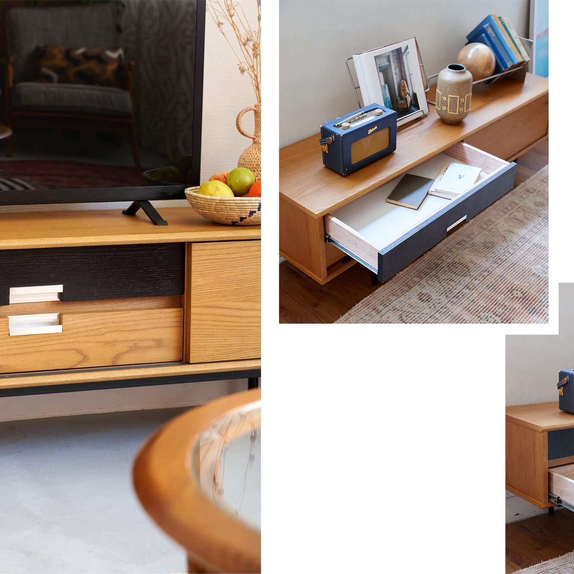 AROS TV BOARD は、北欧デンマークのヴィンテージキャビネットから着想を得た、端正で温かみのあるデザインが特徴です。前面の縁には無垢材を大胆に使用することで、素材そのものの存在感をしっかりと感じられる仕上がりとなっています。