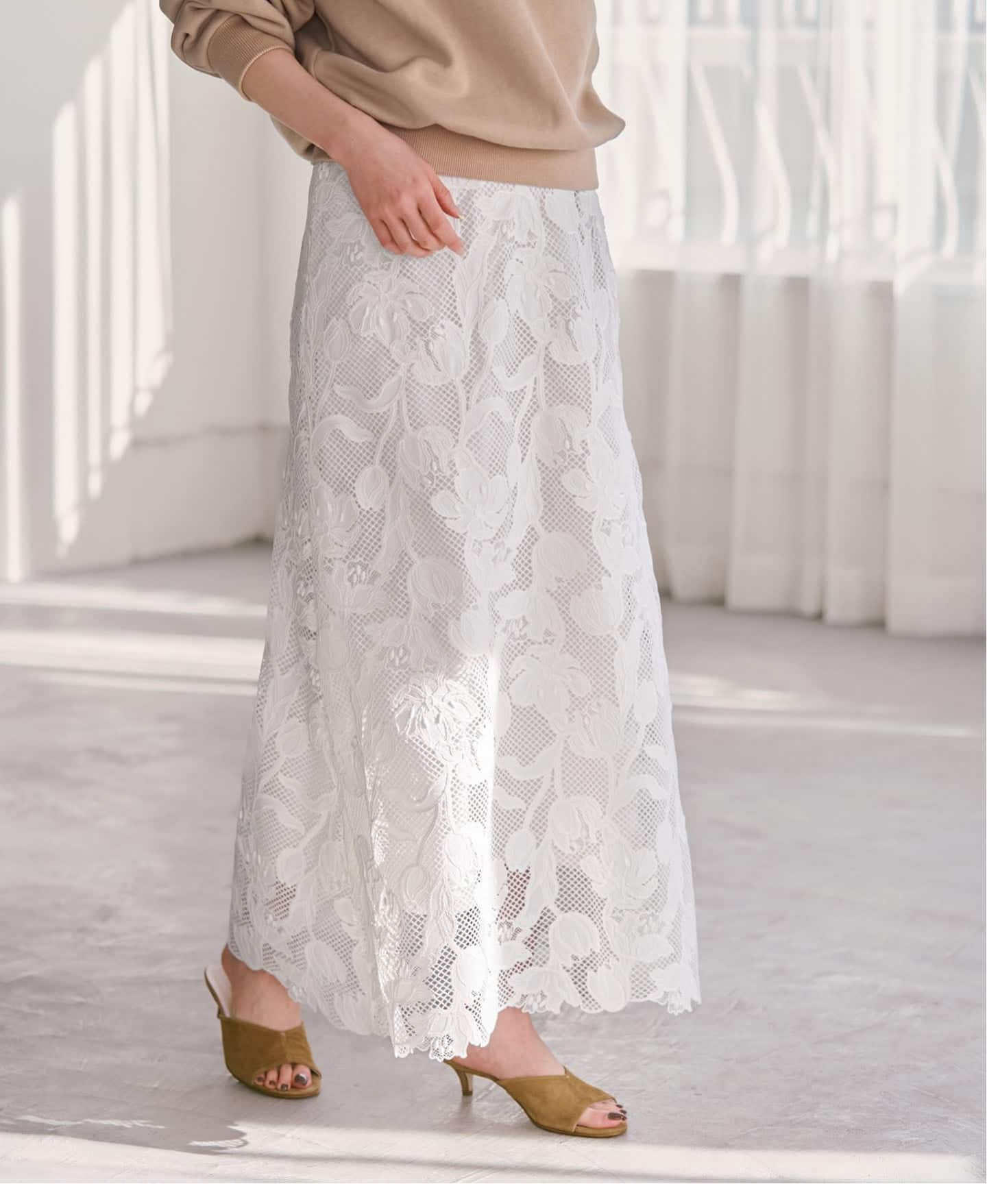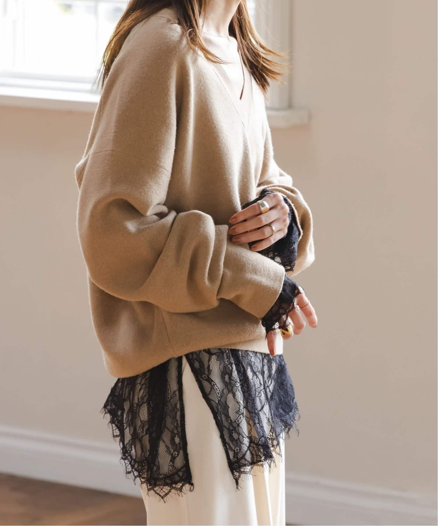 身体が泳ぐようなオーバーなサイジングは、甘くなりすぎずスタイリングをこなれた雰囲気へと導いてくれます。