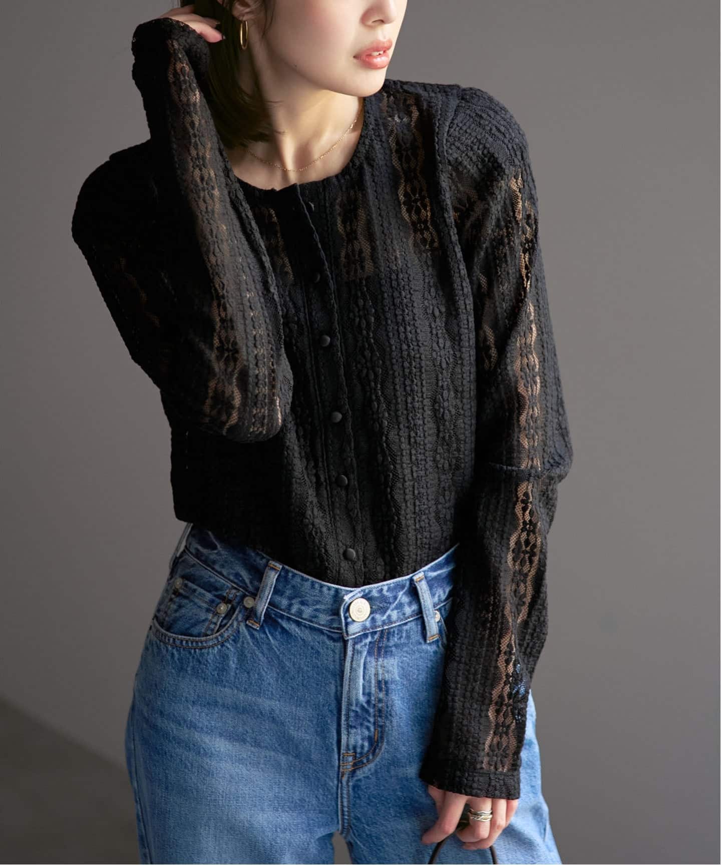 絶妙な透け感とすっきりとしたオープンカラーで、春夏らしい爽やかな印象に纏えるのが魅力。