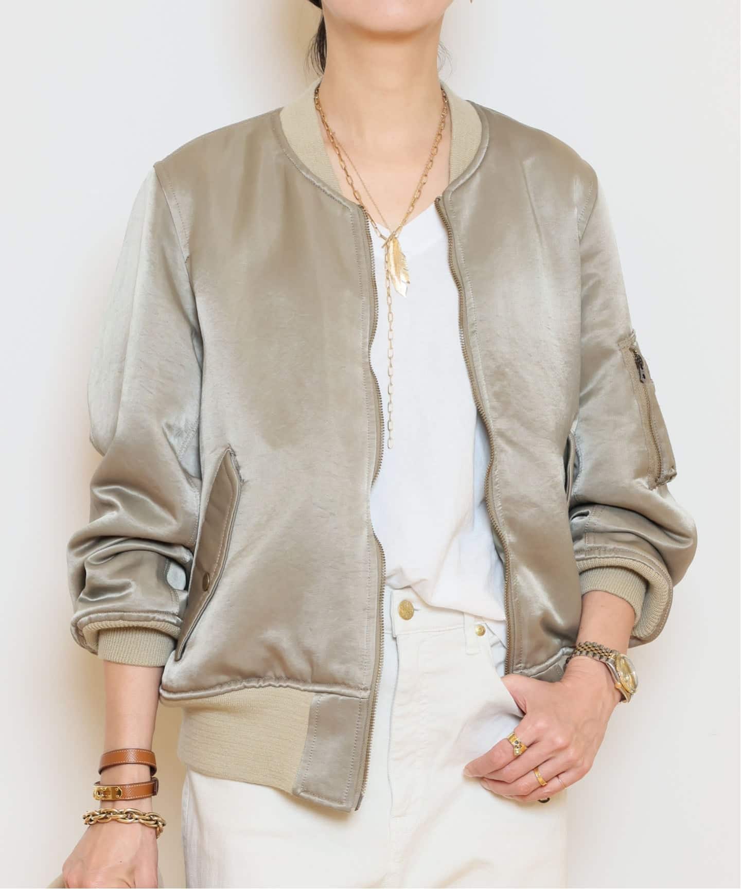ベージュを含んだ柔らかなカーキに、さりげない艶。ミリタリーでもどこか女性らしいムードが魅力。