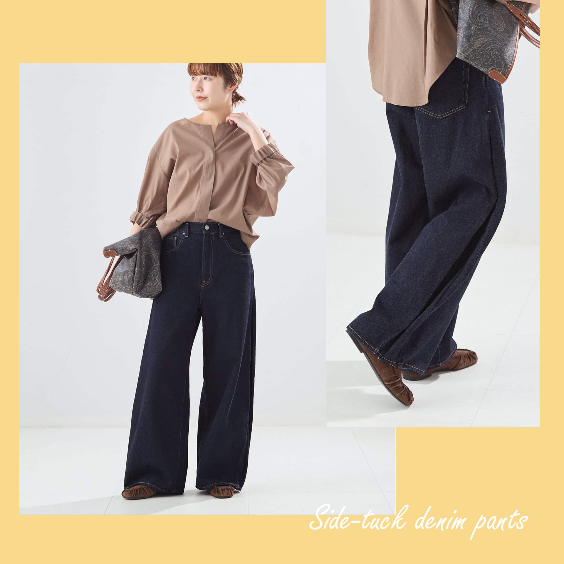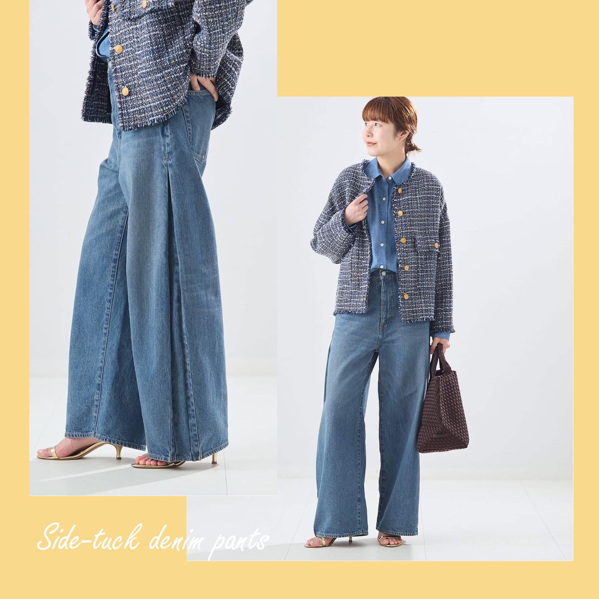 今年取り入れたいNEWデニムはサイドの深く大胆なタックデザインがポイント。トップスをインしたり、クロップド丈をコーディネイトすると◎