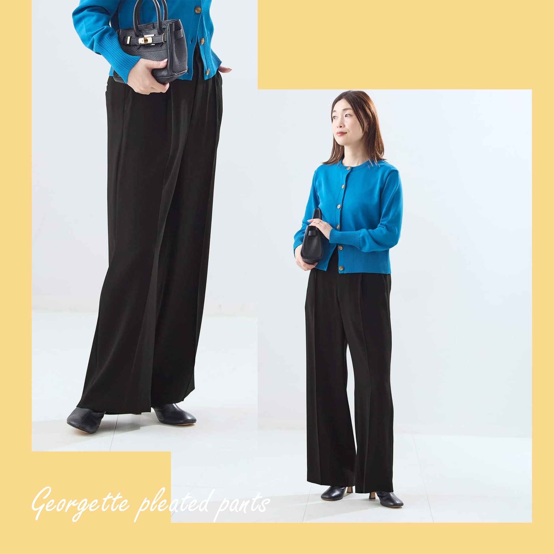 程よい落ち感と美しいドレープが特徴のタックパンツ。ウエスト部分に施されたタックが、縦のラインを強調し、自然な脚長効果を演出します。