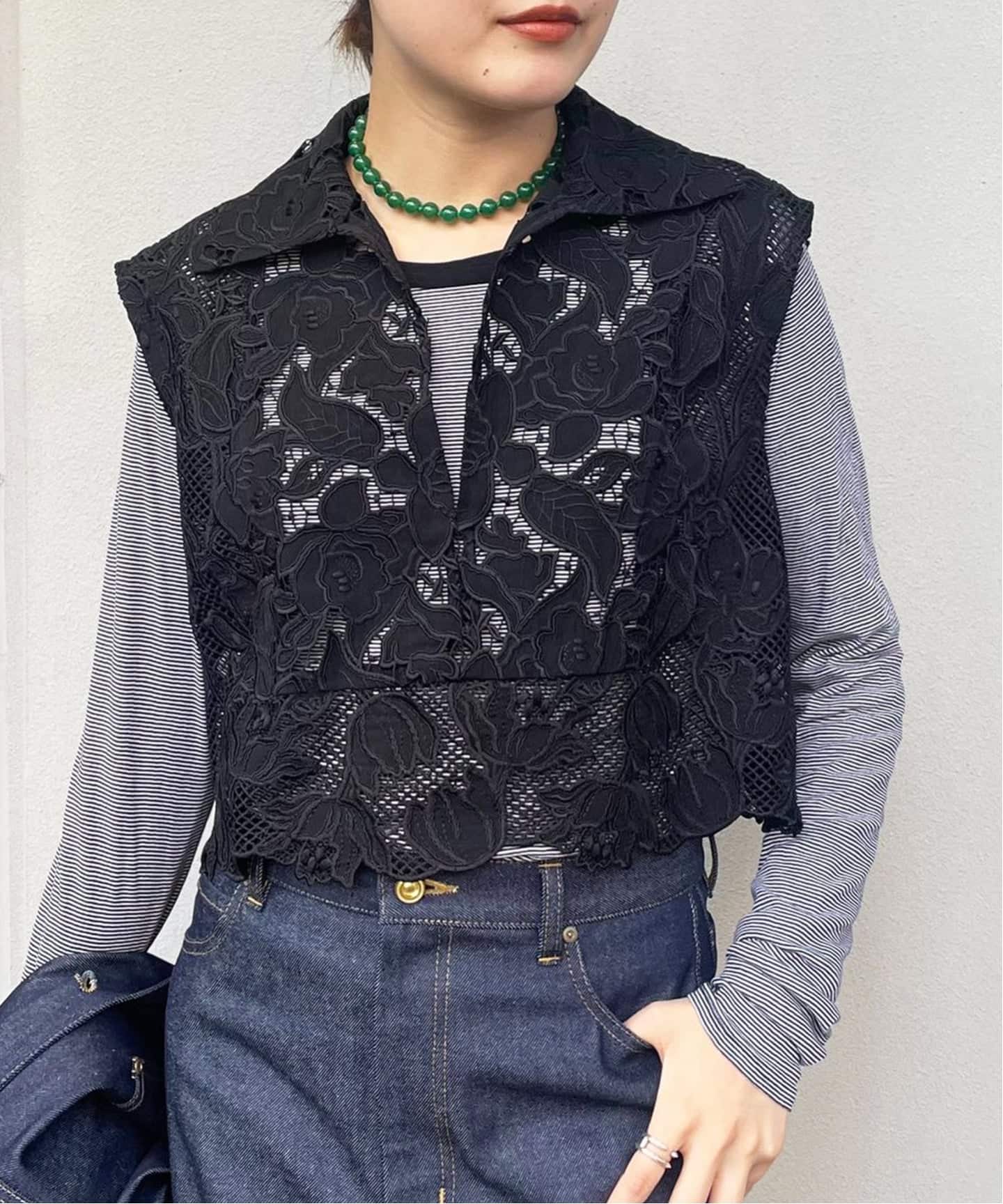 そのレースをL'ESSAGEらしく、ベストに仕上げました。フロントのボタンにもこだわり、ヴィンテージ調のボタンをカラーによって違うボタンを付けています。スラックスパンツとのONスタイルはもちろん、デニムやイージーパンツとさらっと合わせても◎