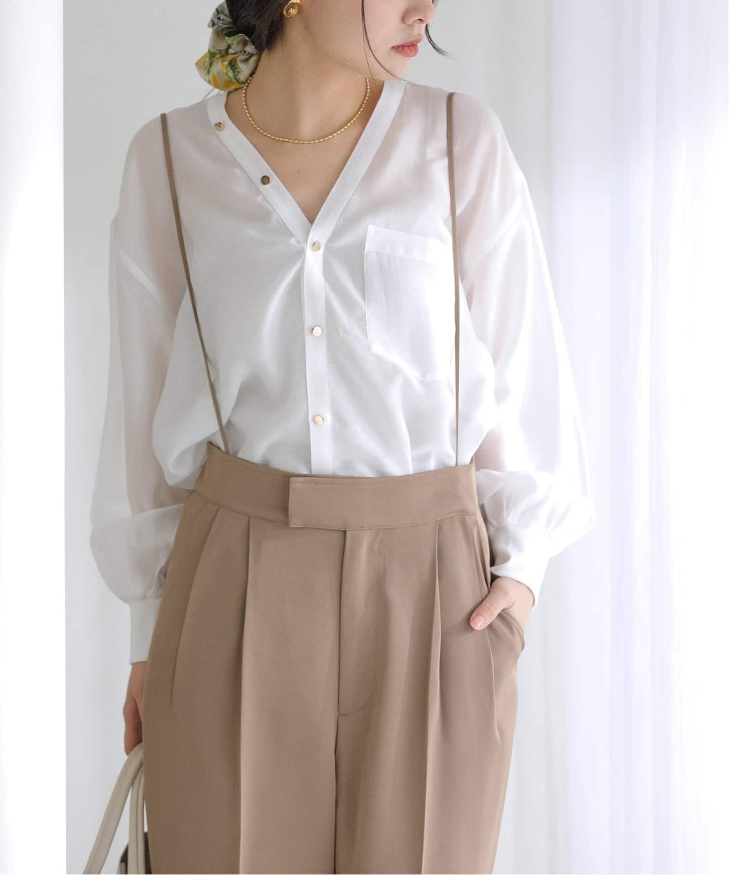 繊細な透け感が魅力のVネックシアーシャツは、軽やかな素材が女性らしい柔らかさを演出します。