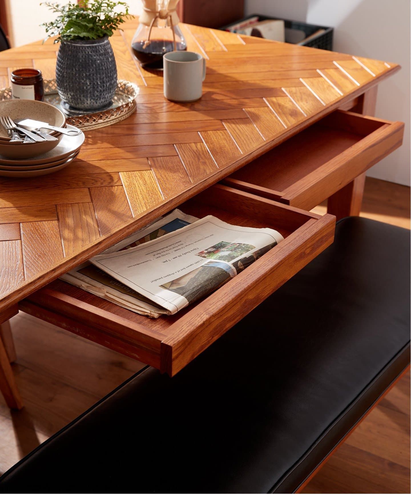抽斗が2杯ついているので、ランチョンマットなどのテーブルカトラリーの収納や、デスクワークなどの食事外で使用した際の書類やガジェットなどをサッとしまうのにとても便利です。