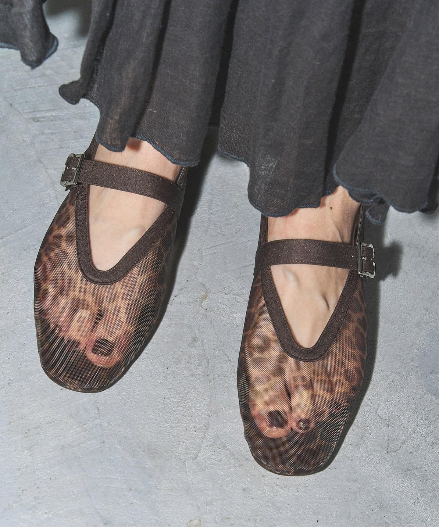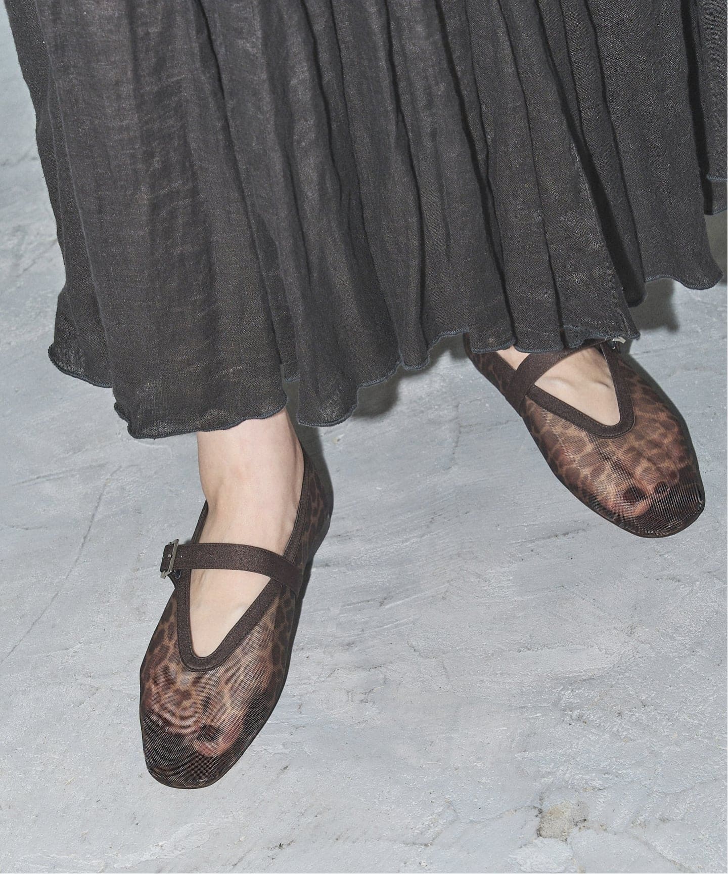 ナイロンチュールにレオパード柄をプリントした、モードなデザインが他にはないメリージェーン。通気性が良く盛夏でもサンダル感覚で履いていただけます!