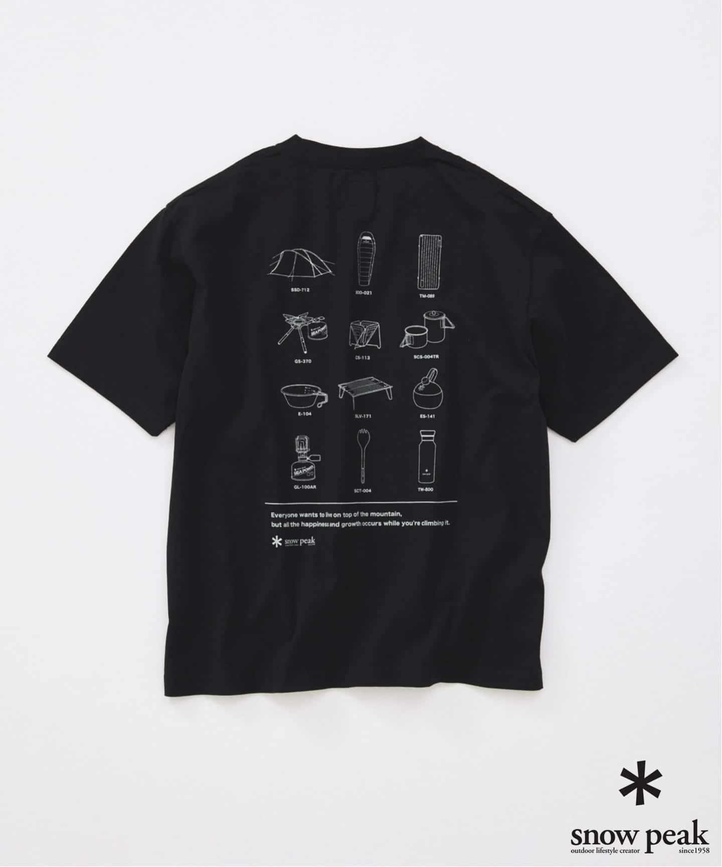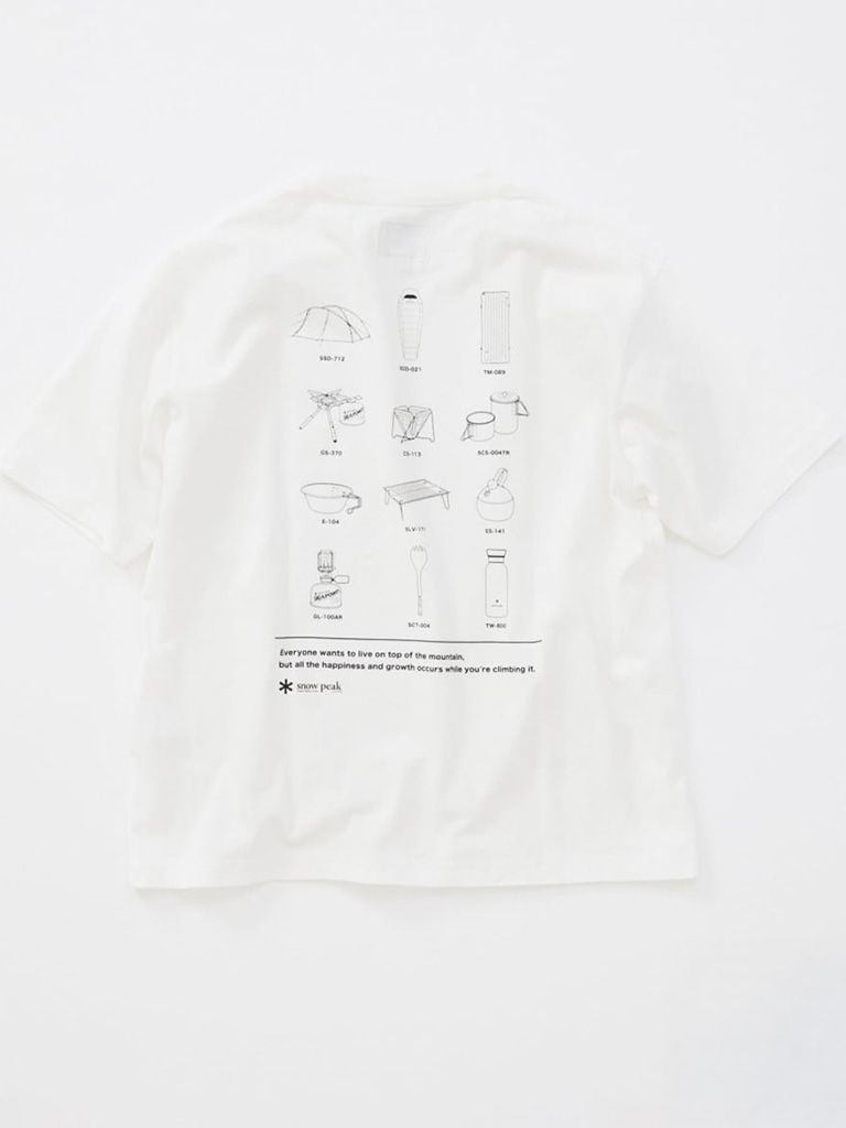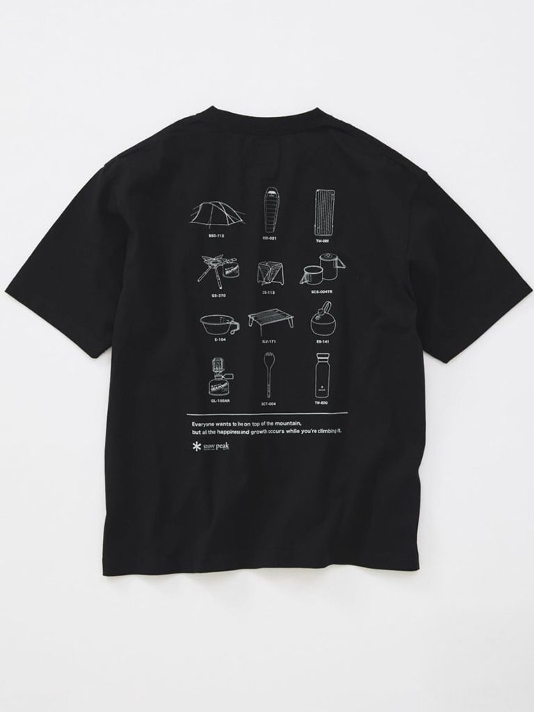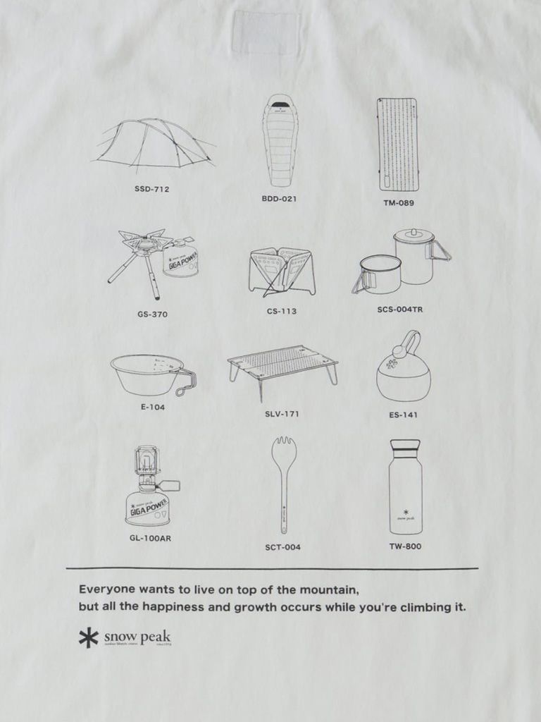 スノーピークのギアをモチーフに、ソロキャンプやバックパッキング装備を“MAPテイスト”で描いたバックプリントT。