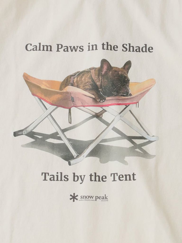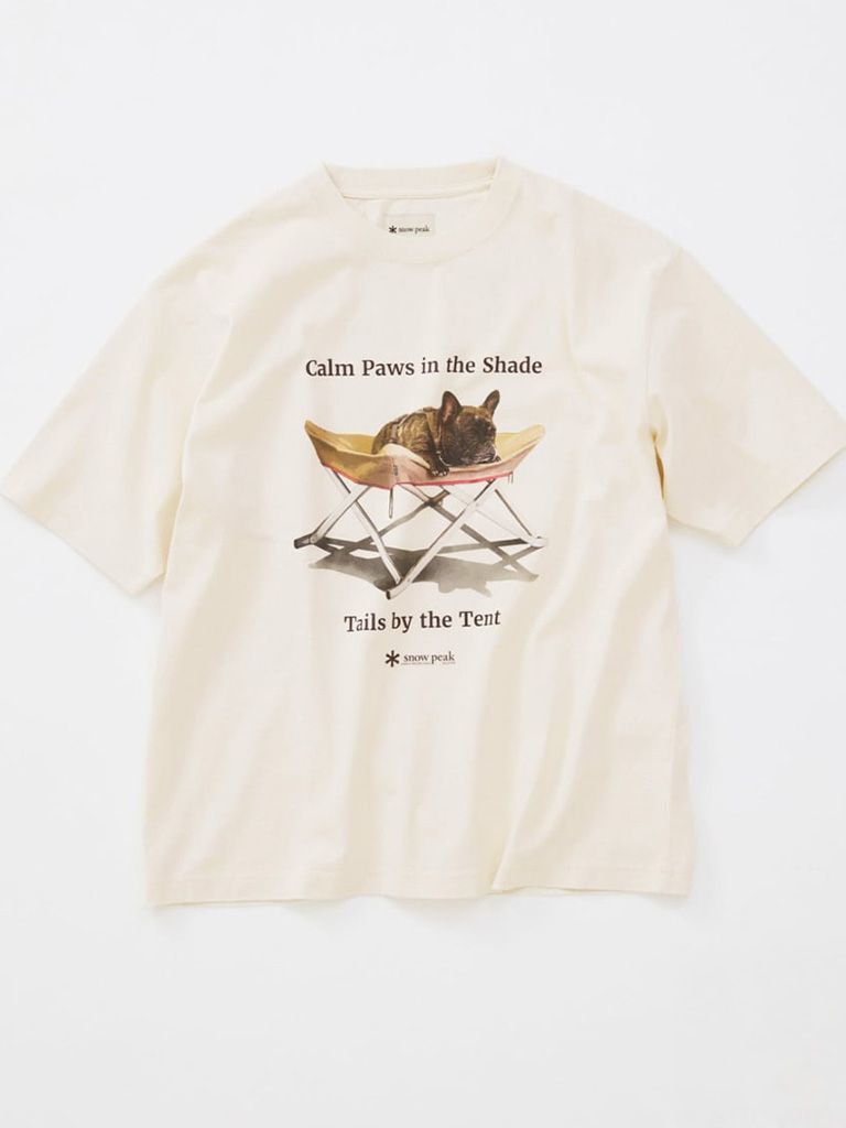自分のコットの上から穏やかなキャンプ風景を眺める犬を描いた、どこか心和むグラフィックT。