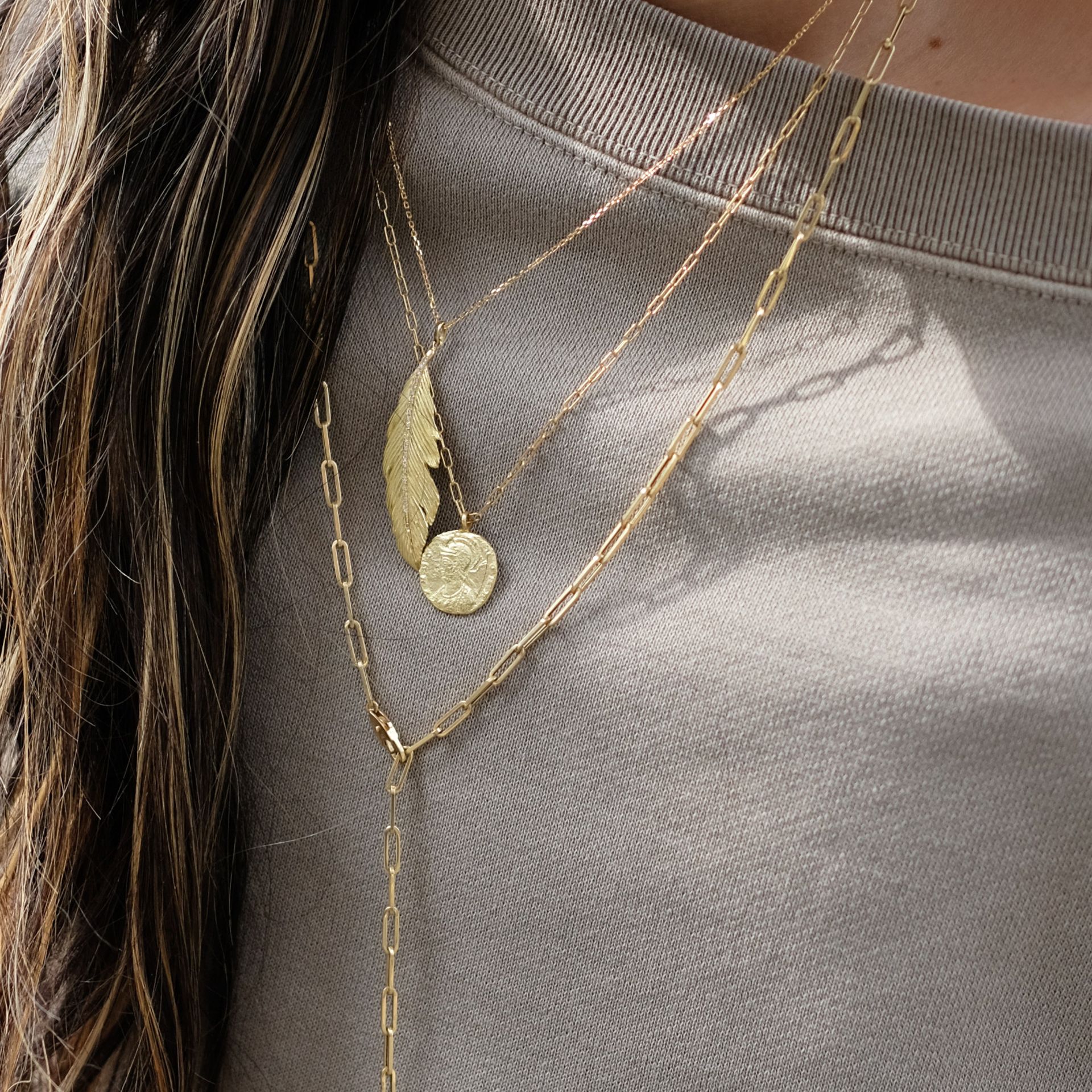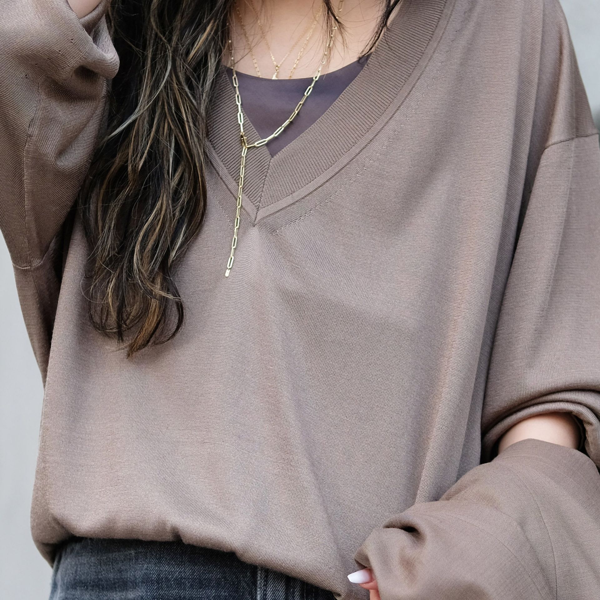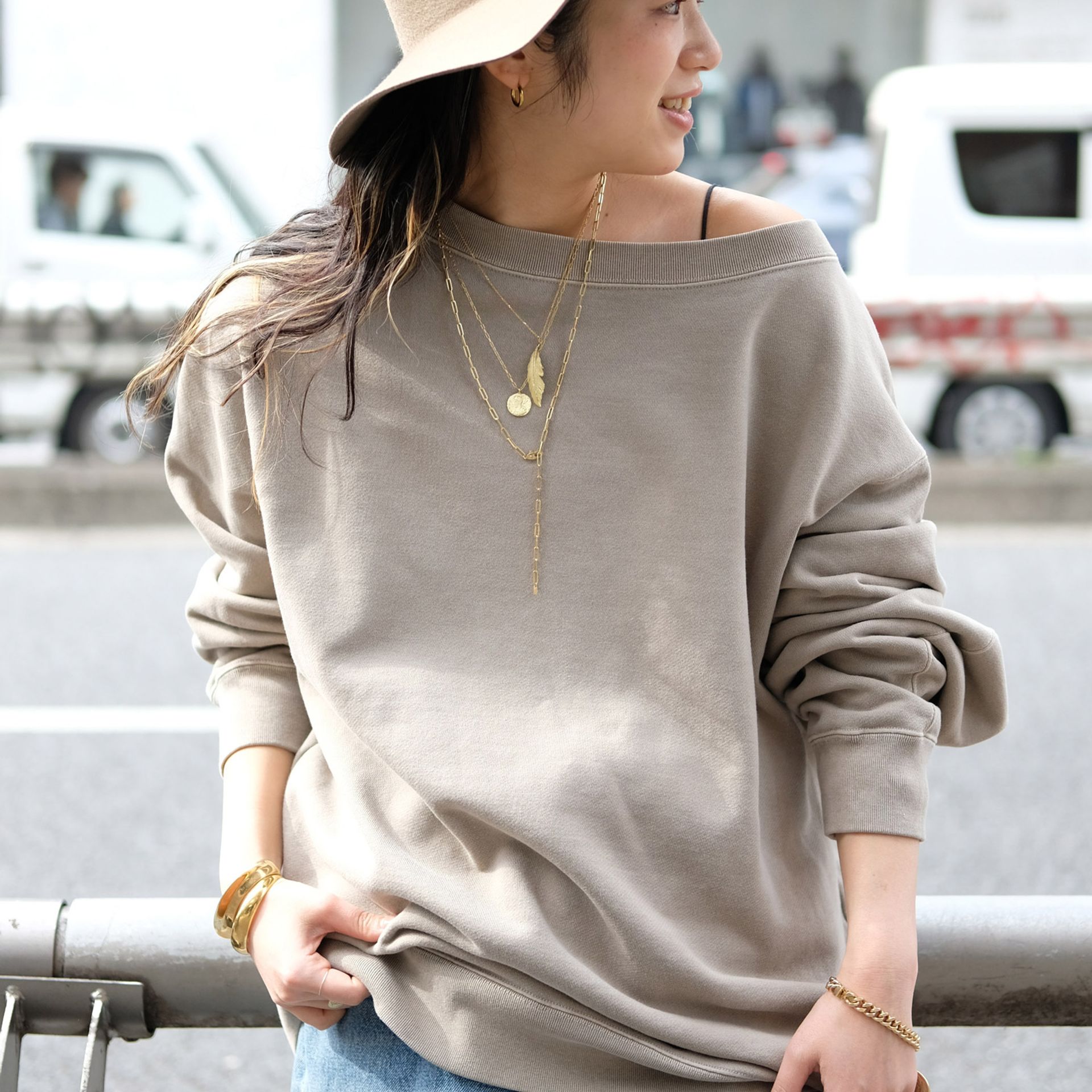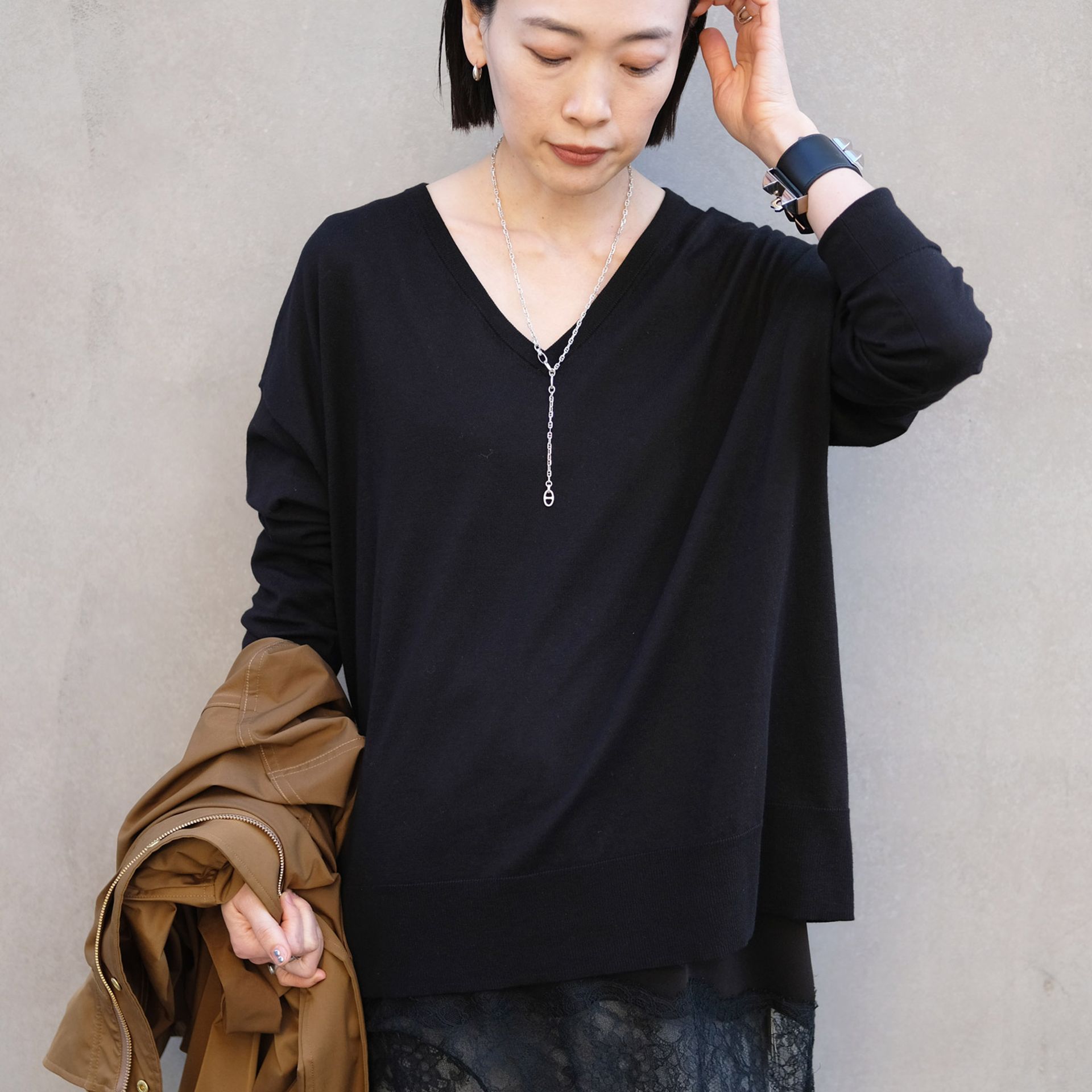 アクセサリーはGIGIの華奢なネックレスをレイヤードして、品よく。