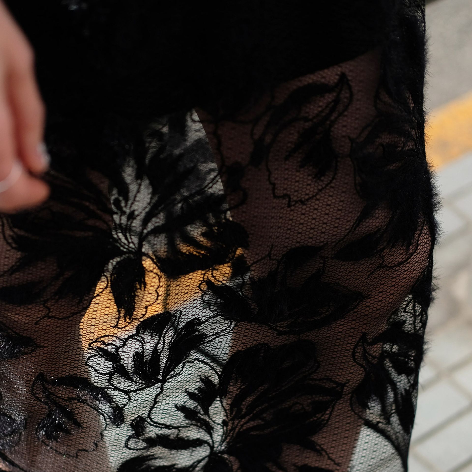 コーディネートが重たく見えないようにシアーのレースティアードスカートで軽さを出しました。