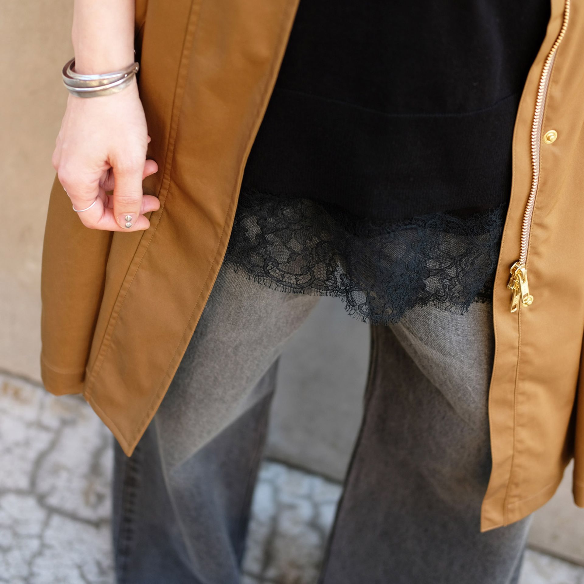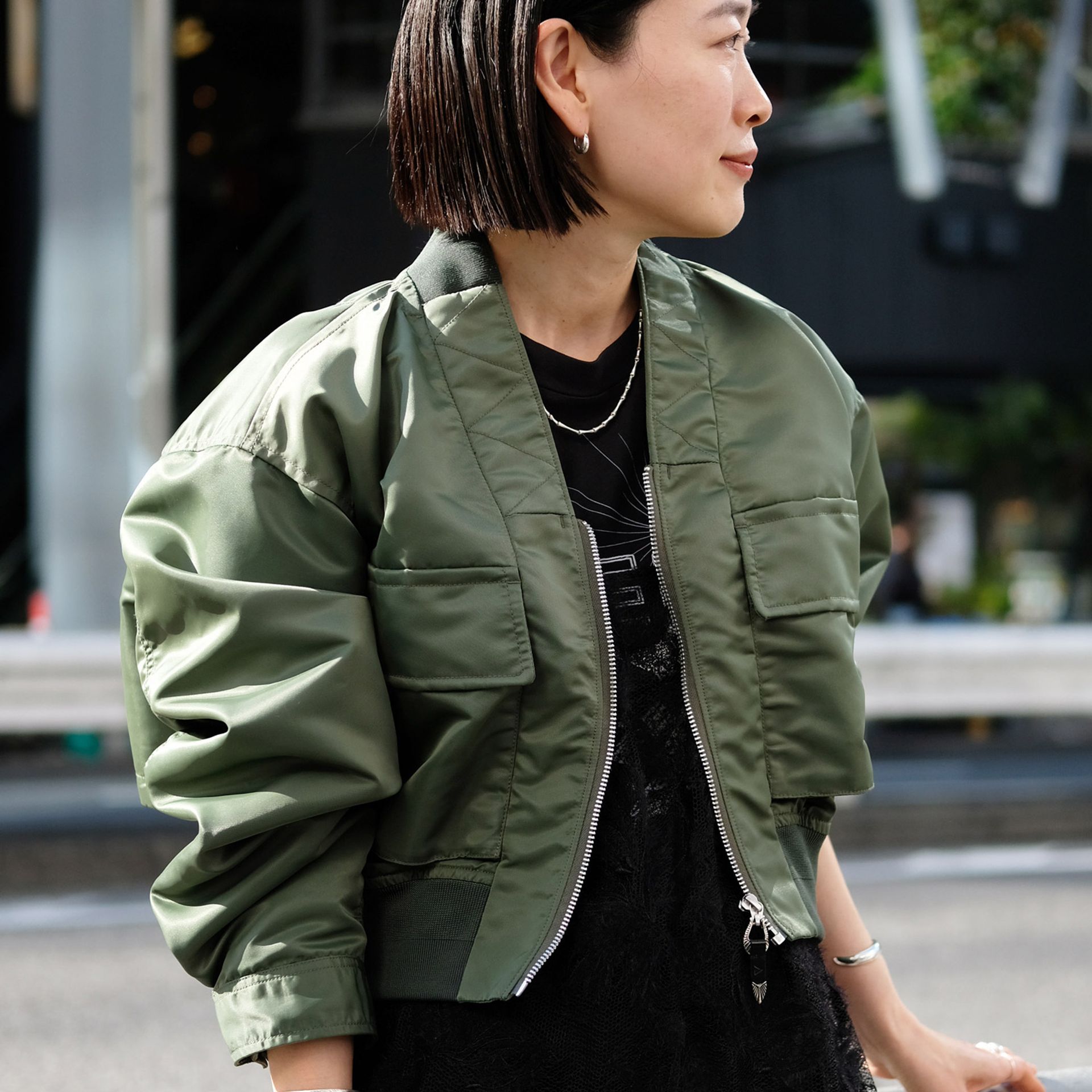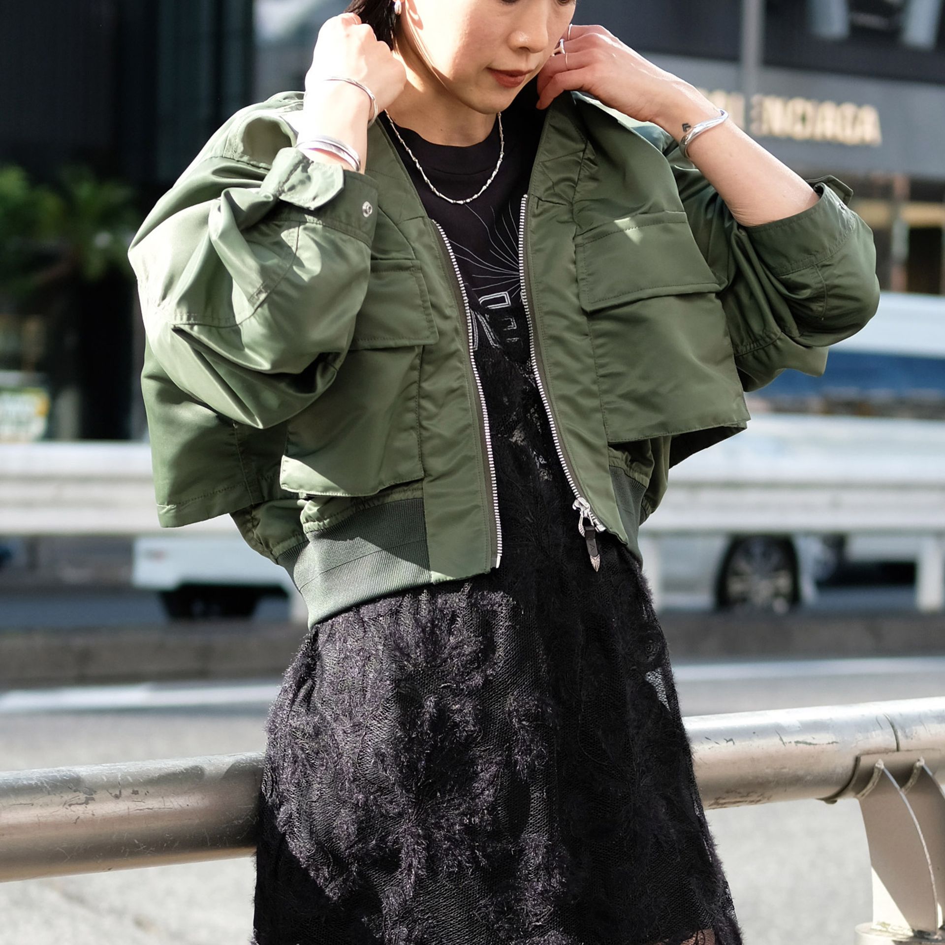 今シーズンのムードを意識して、いつもはあまり着ないレースも私が取り入れるならミリタリーで。