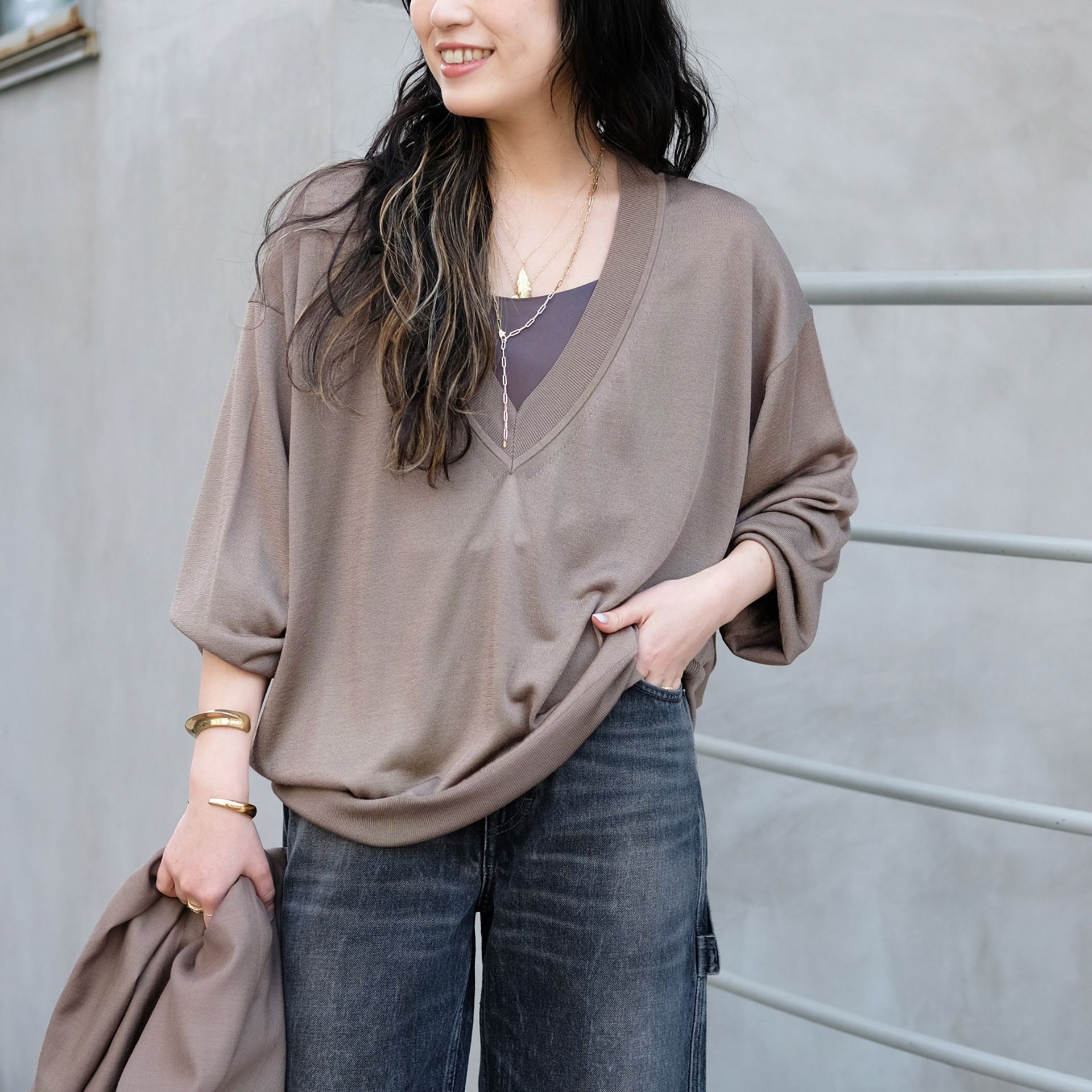 秋冬で人気だったディープVネックニットが春夏素材の程よいツヤ感でカジュアルなデニムと相性抜群。