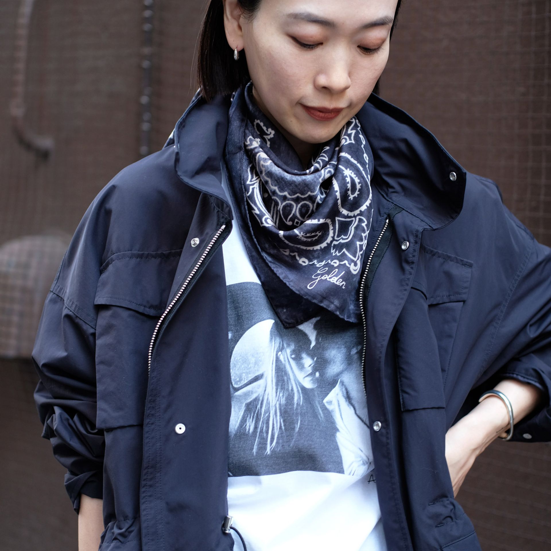 インナーにはプリントTシャツと柄物のスカーフをプラスしてアップデート。
