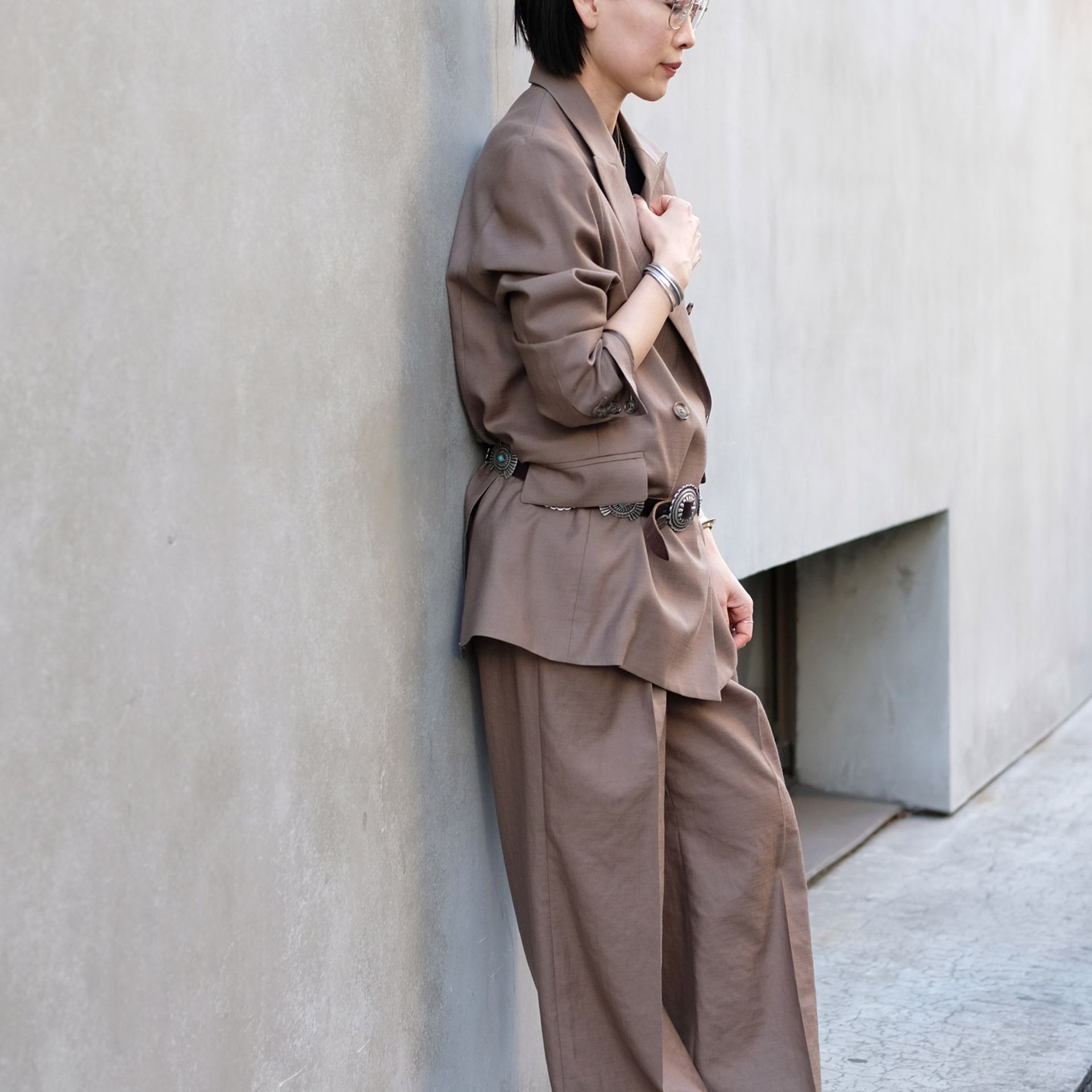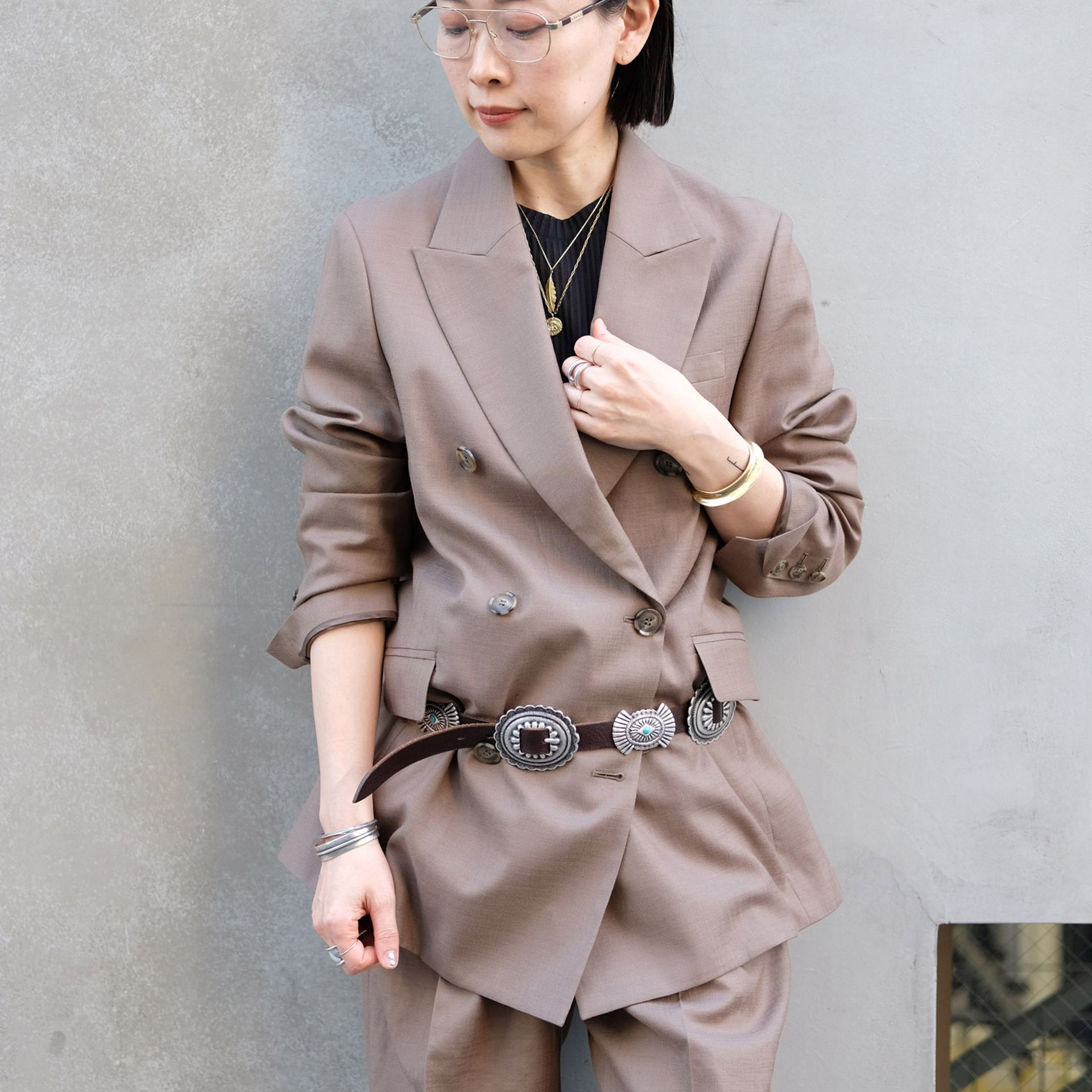 コンチョベルトやコンバートを小物に合わせて、APのベーシックなジャケットのセットアップを今年のムードで。