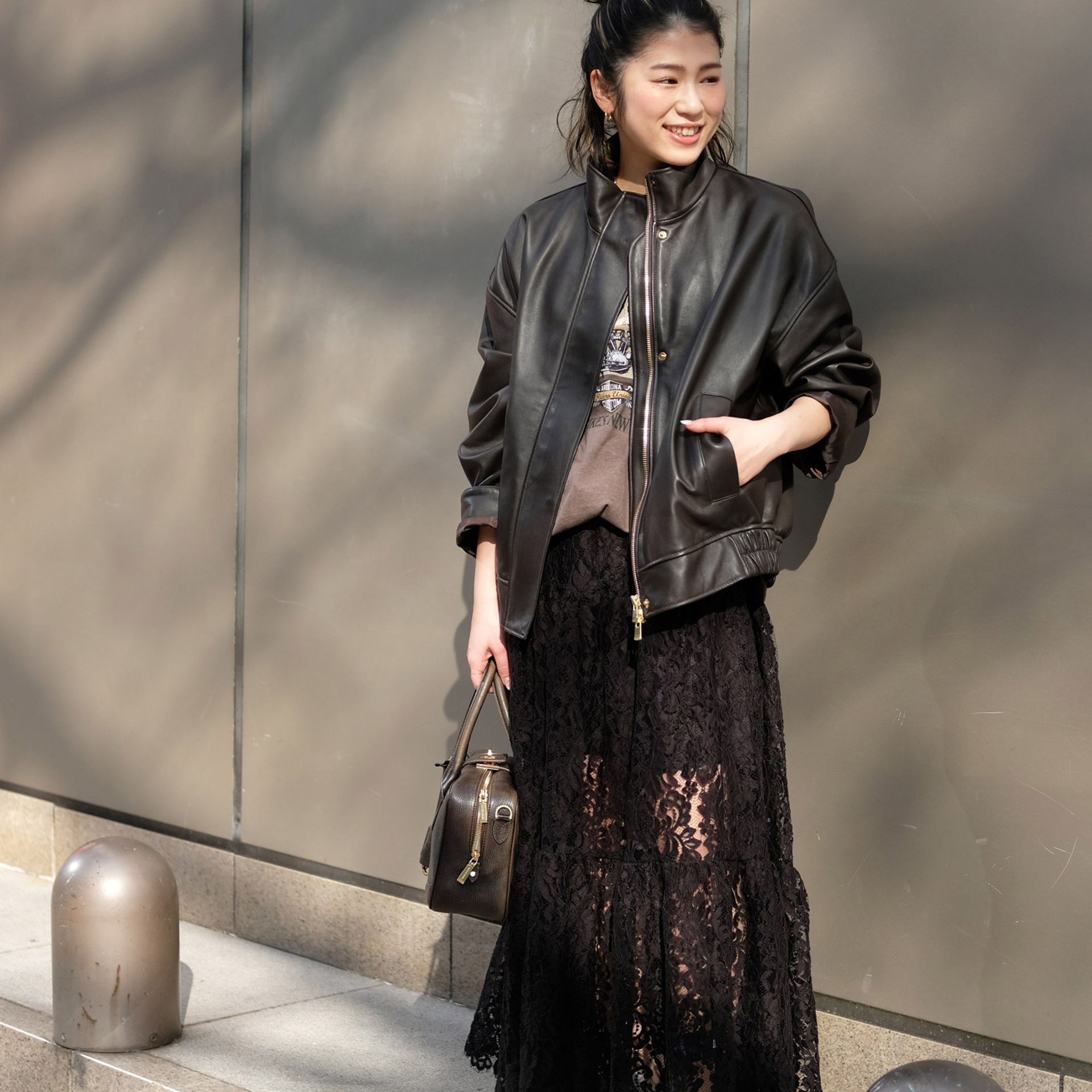 異素材のブラックをあわせて奥行きのあるコーディネートを意識。