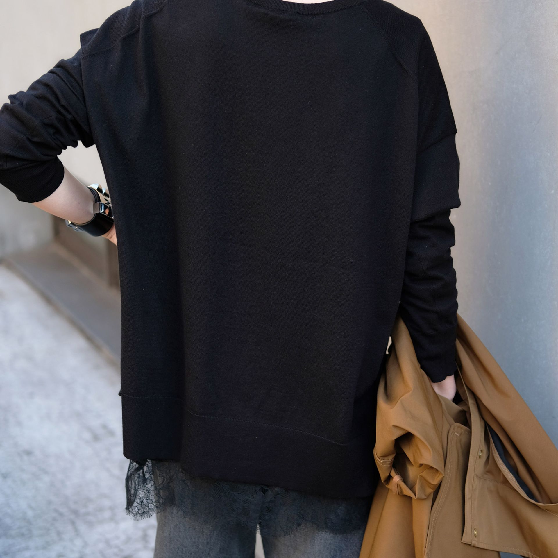 シンプルなニットもレースを覗かせてレイヤード。