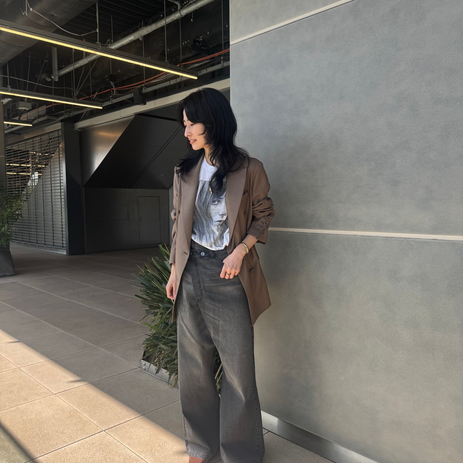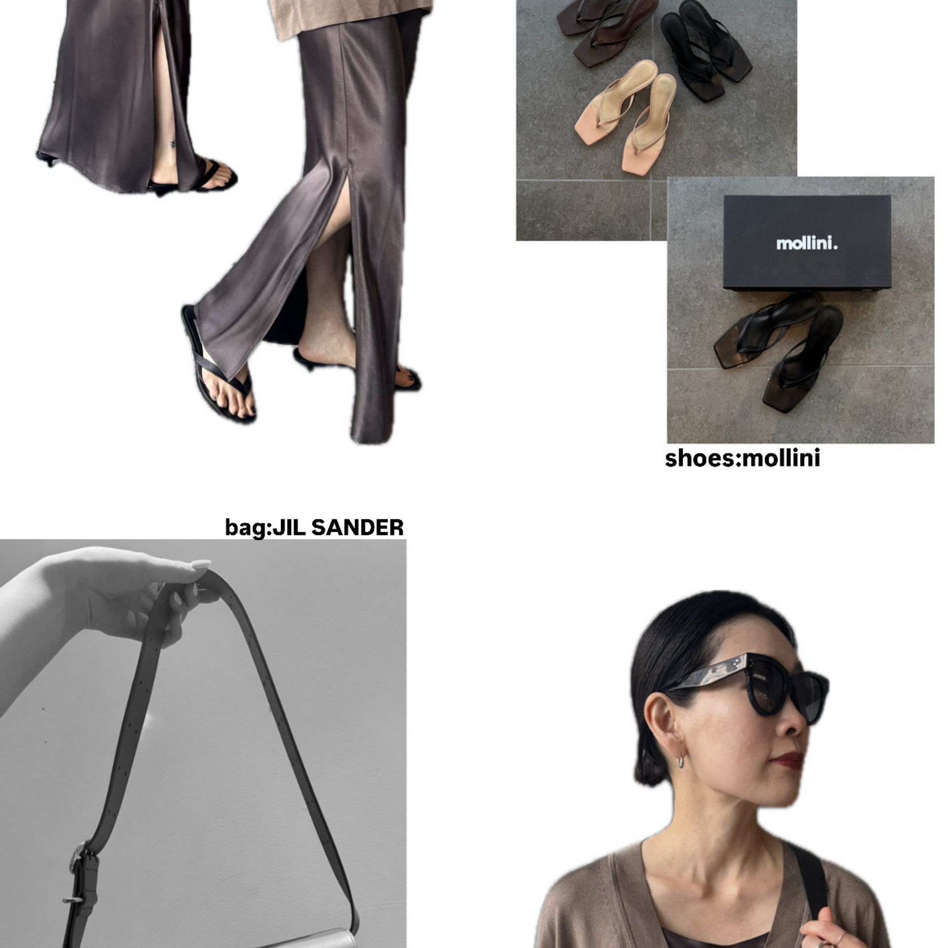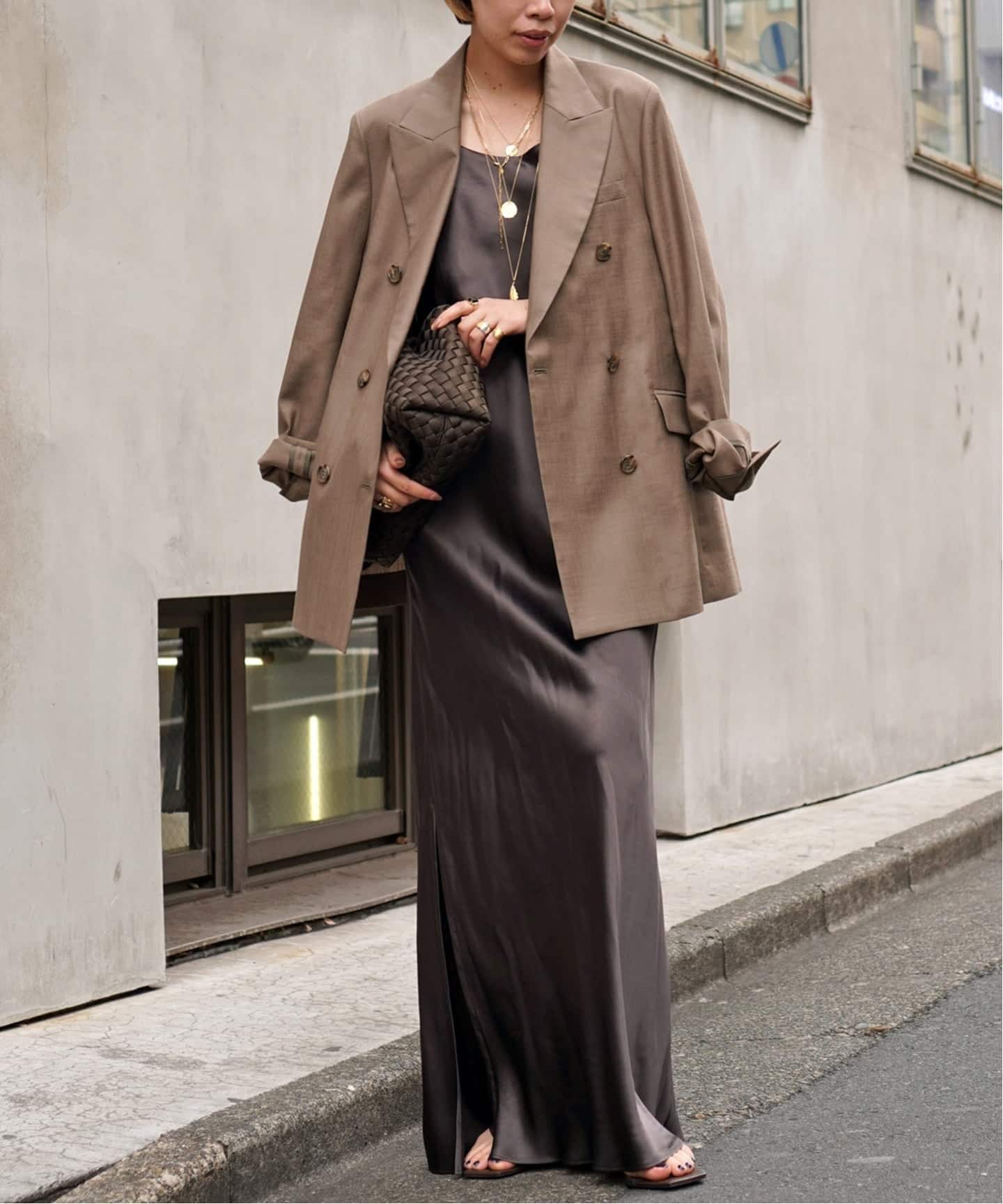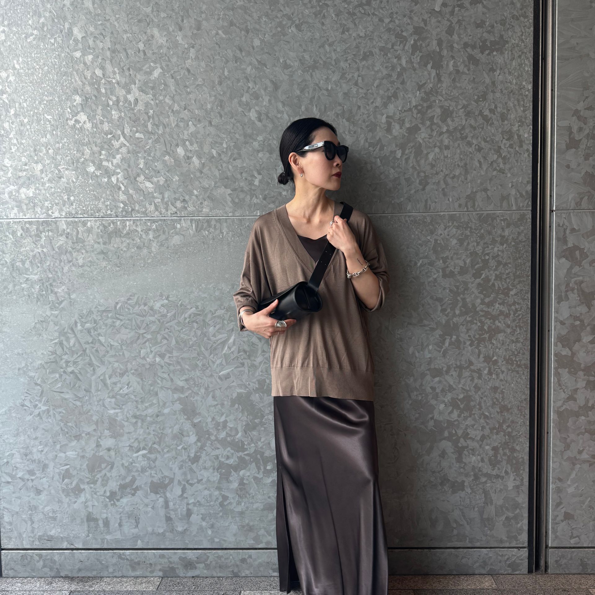 今季はブラウンをニュートラルカラーで合わせてみたい!今の時期は上からニットやスウェットでレイヤードできるし、ジャケットやシャツの中に着てサテンの艶をプラス。