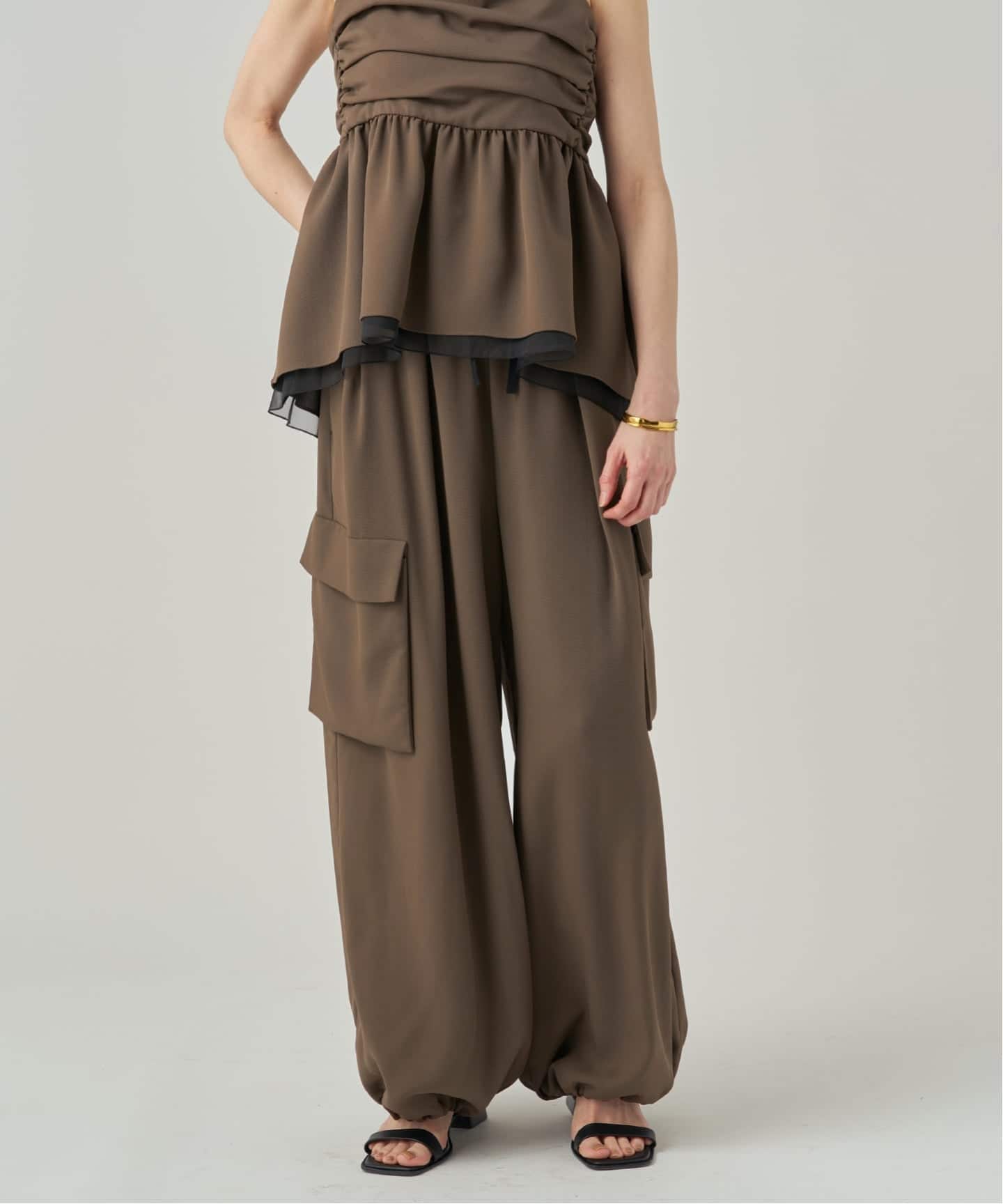 ティアードの柔らかなドレープと、ワイドパンツの大胆なボリュームが美しく調和したセットアップ。