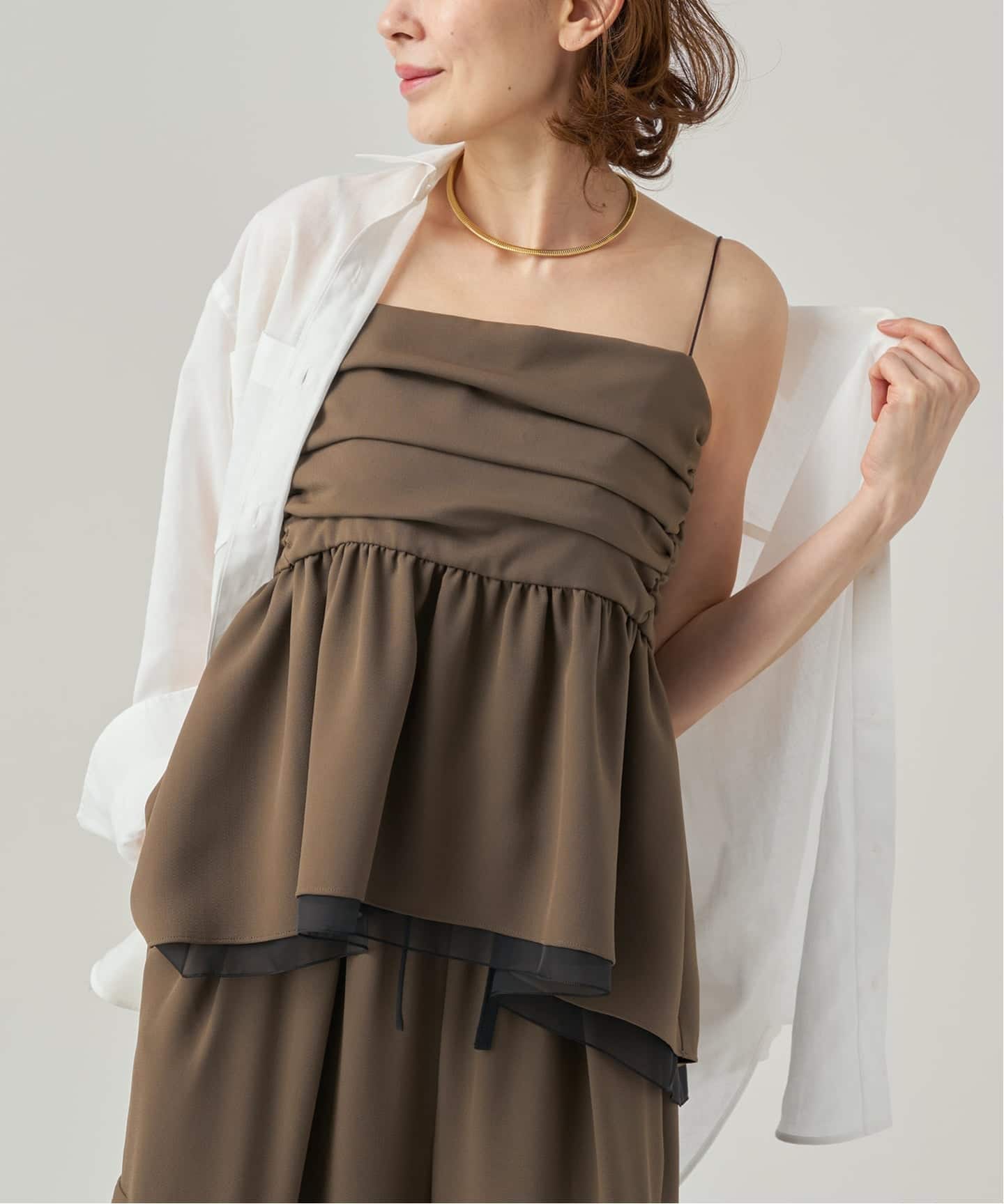 キャミトップは華奢なストラップと流れるようなドレープが印象的で、裾からのぞくシアーのレイヤーがスタイリングにモードな奥行きを添えます。