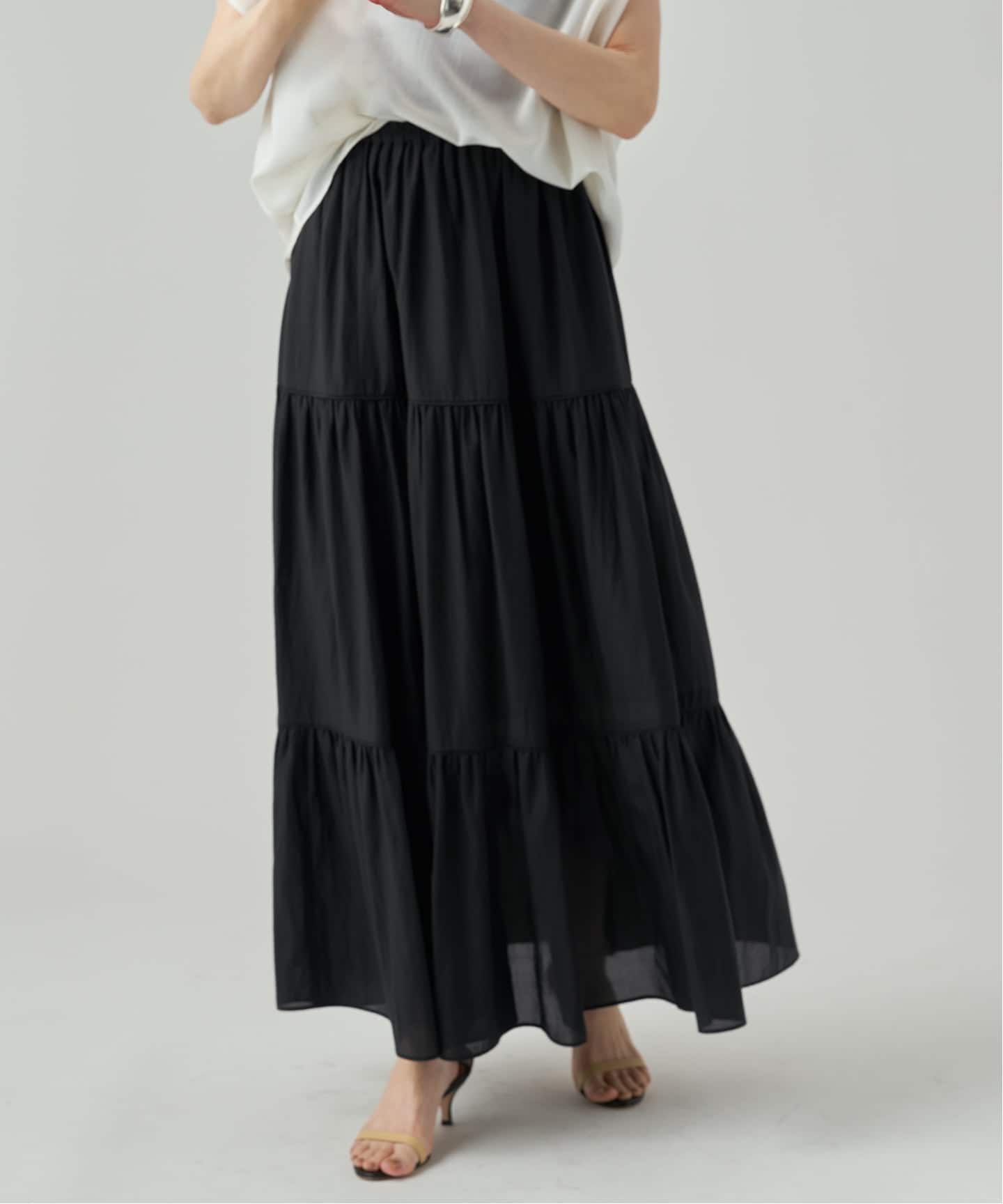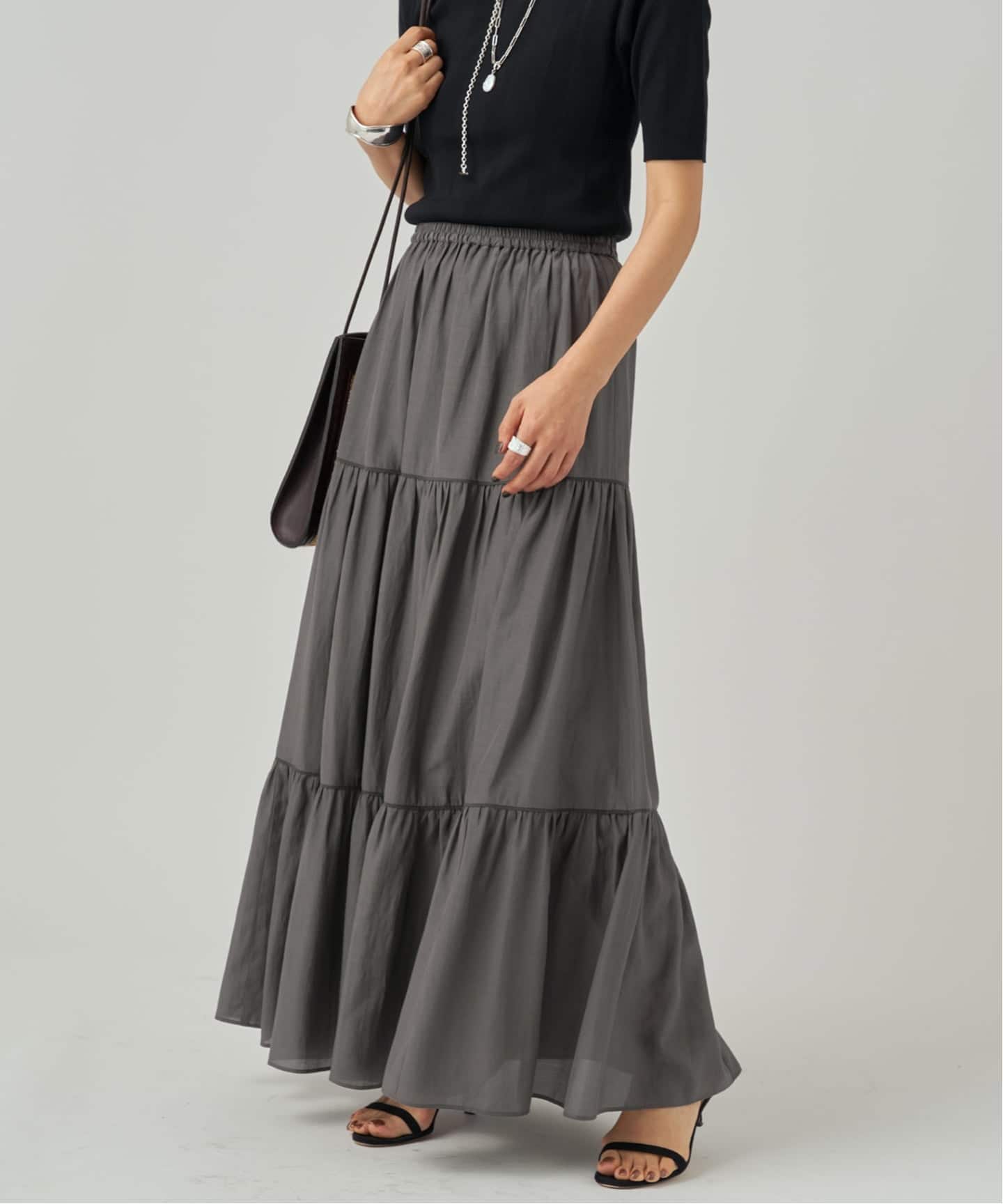 空気をはらむように軽やかに揺れる生地を重ね、ティアードの甘さをミニマルに仕上げたロングスカート。