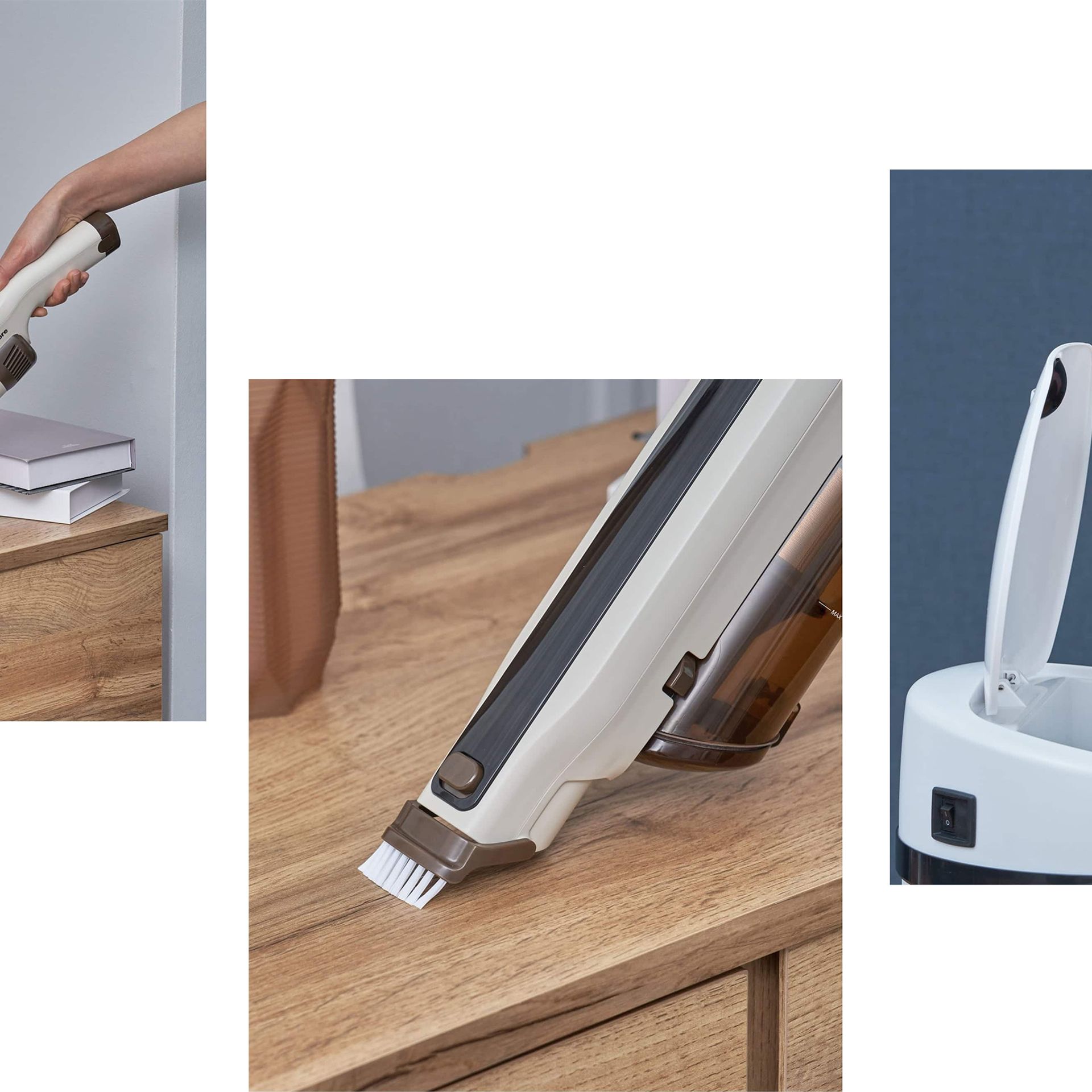 また、ハンディとしてもすぐ使える仕様で、本体側にはブラシが付いているため、棚やブラインドの掃除がワンステップで完了します。