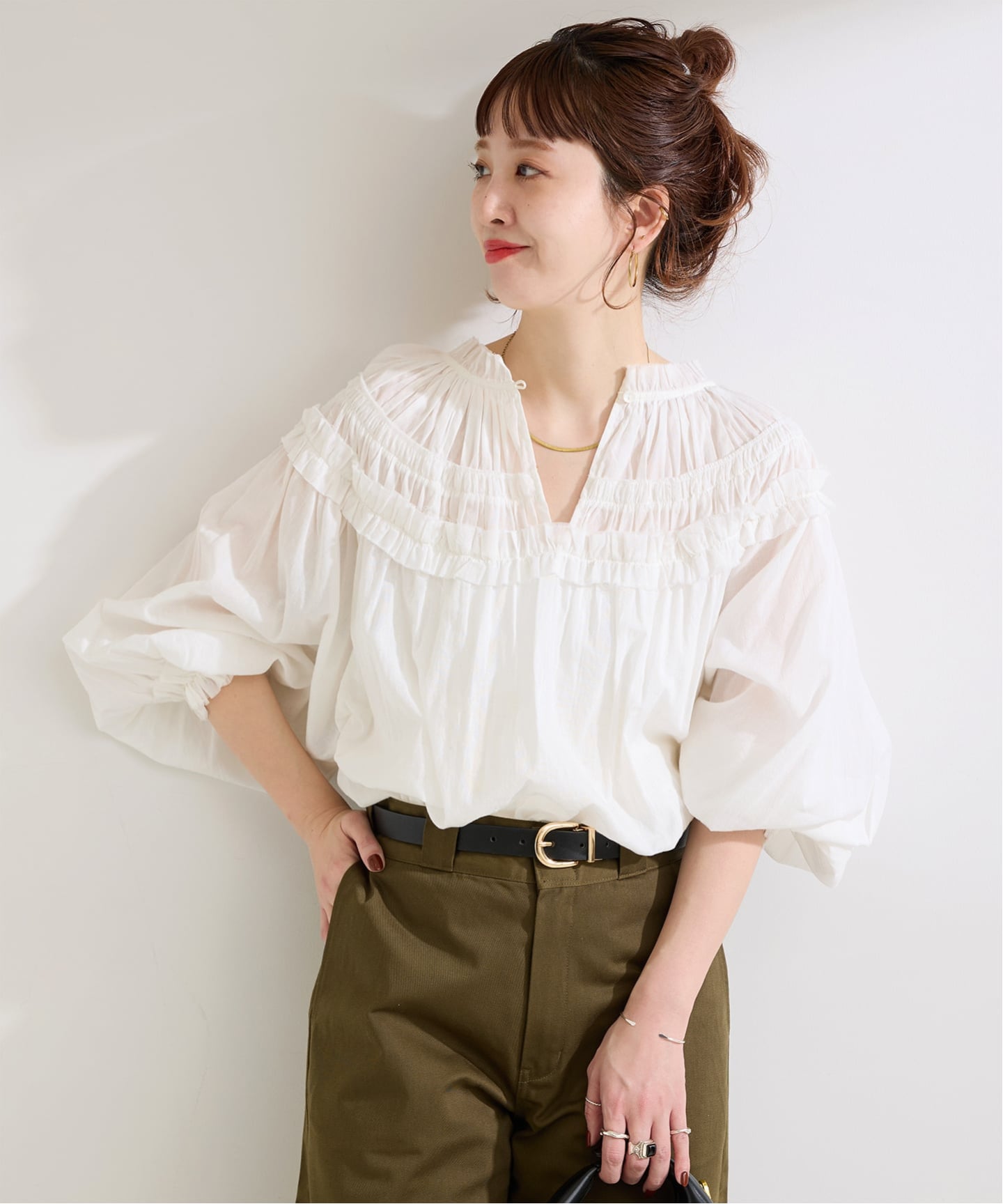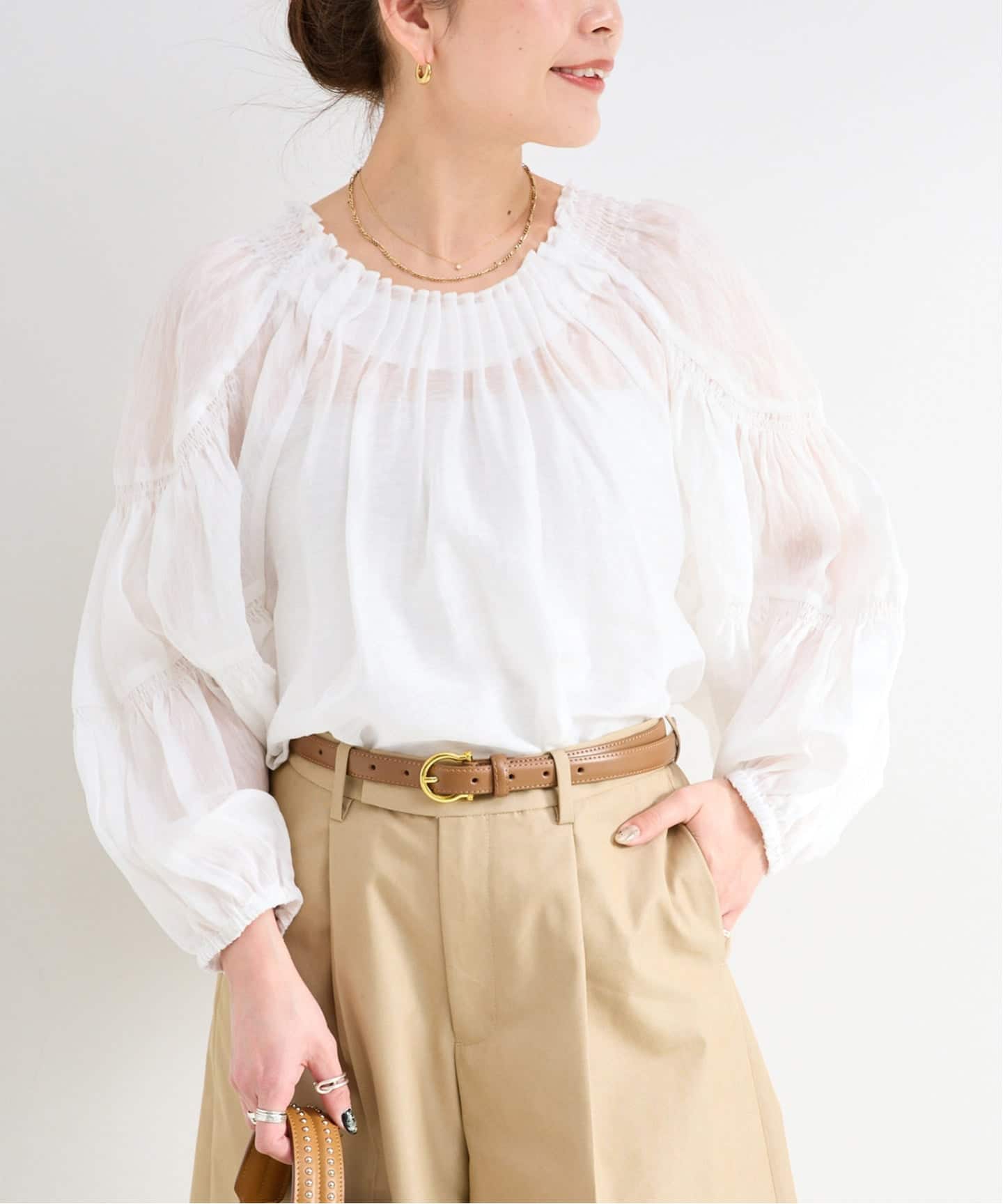 ふんわりと入ったギャザーが自然な立体感をつくり、シンプルなボトムに合わせるだけで柔らかな雰囲気をまとえます。