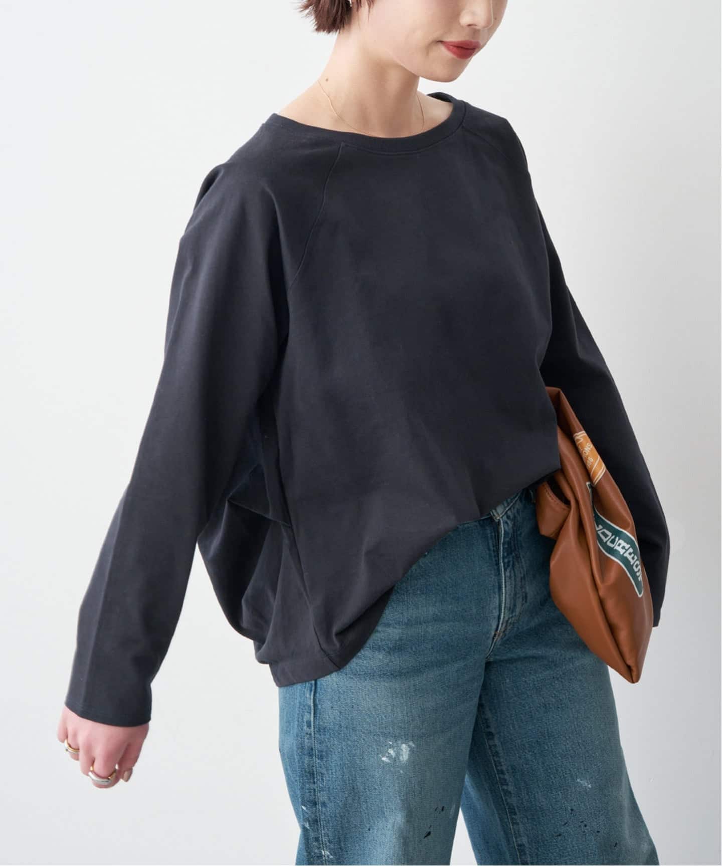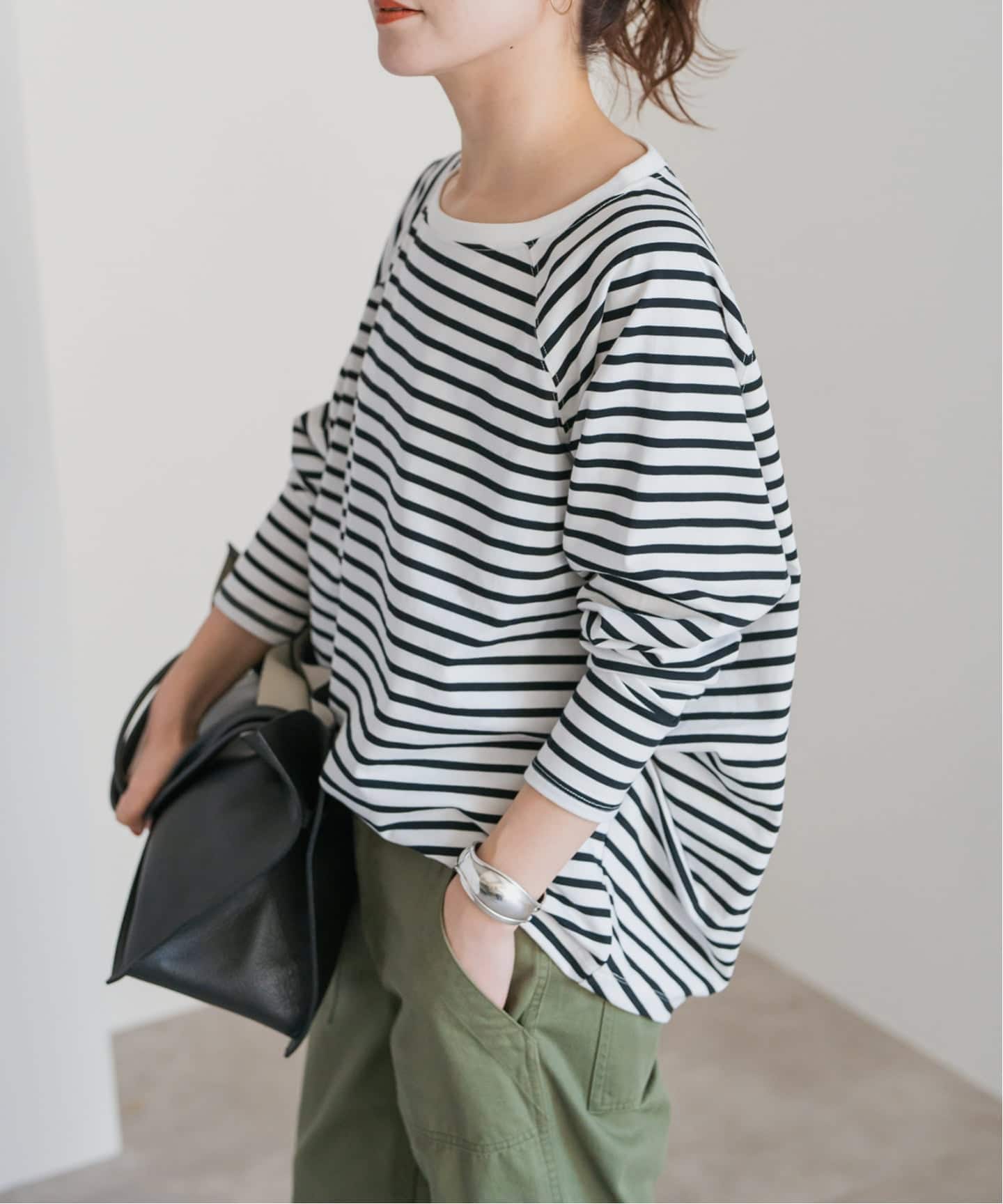 ボートネックが首元をすっきり見せ、上品な抜け感をプラス。