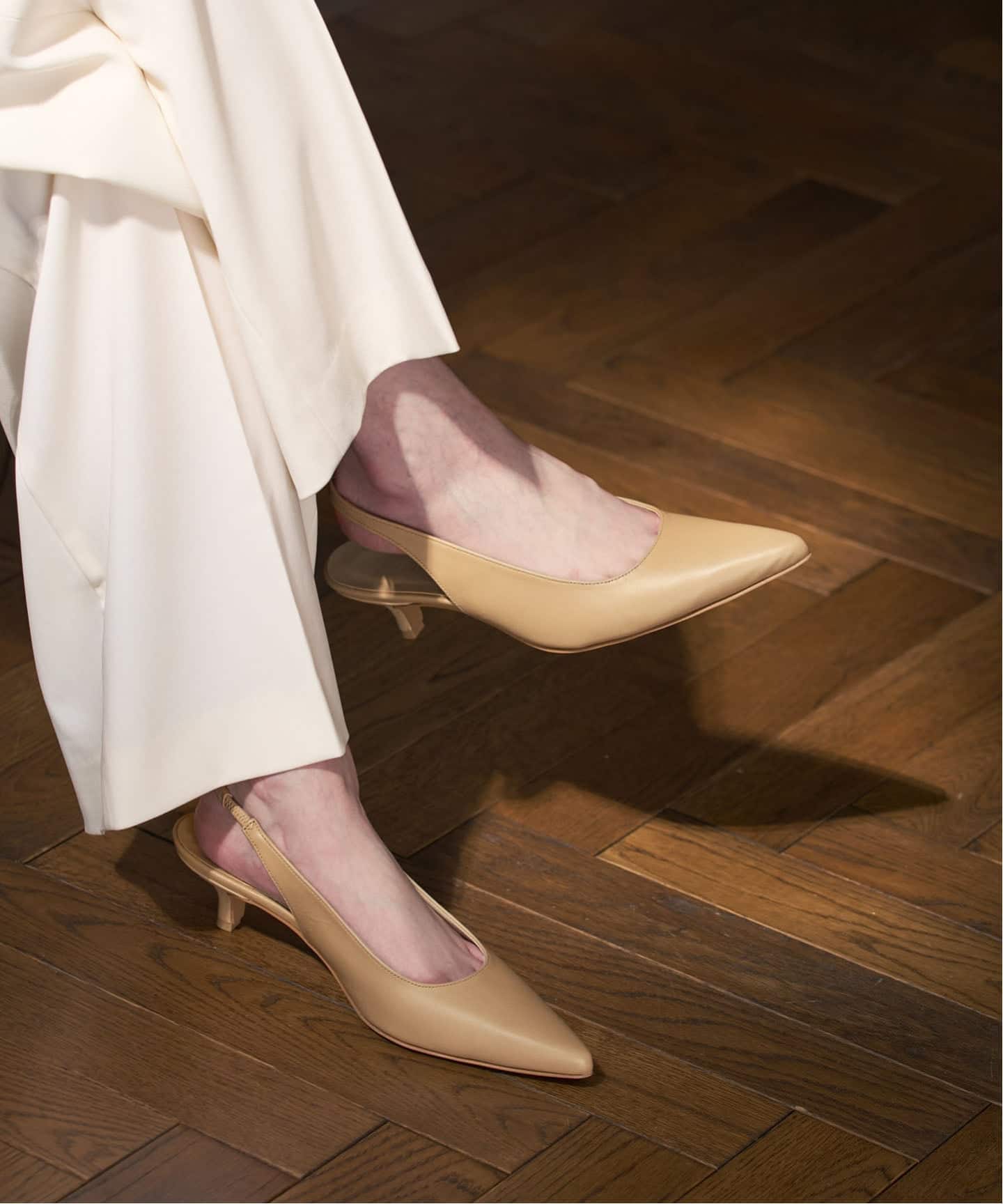 歩くたび揺れるパールピアスやヌーディなベージュパンプスなど、レディムードを盛り上げるアイデアも散りばめて。