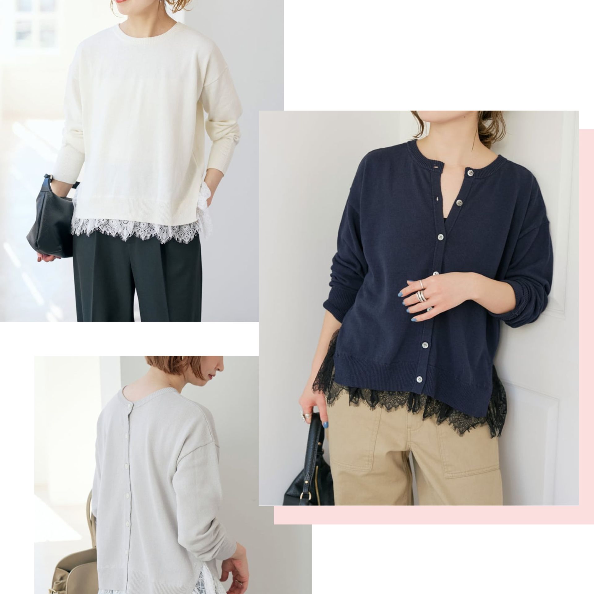 繊細なレースドッキングが目を引く人気カーディガン。